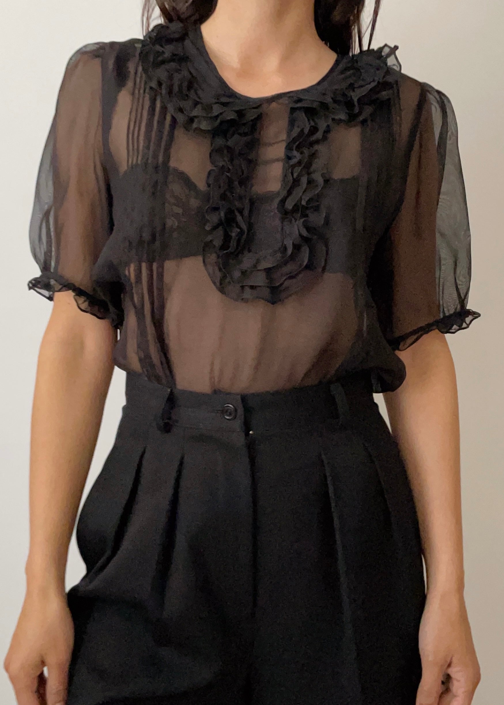 Stunning vintage Chloe black silk ruffle top with subtle princess sleeves. A beautiful piece from the early 2000s in excellent condition. Made in Italy