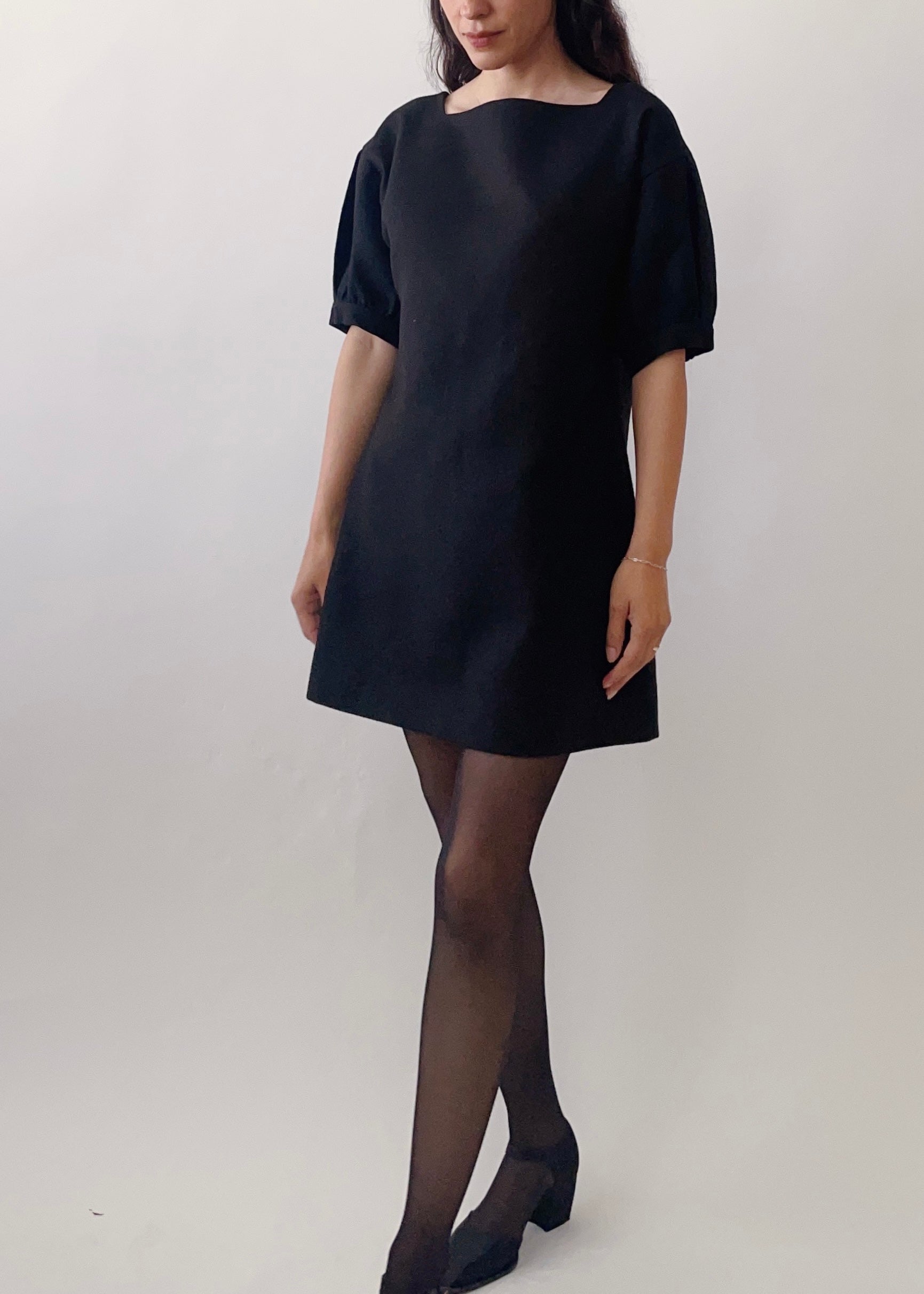 A romantic and dreamy black micro mini dress / tunic with subtle puff sleeves by Yves Saint Laurent. It features functional and beautiful buttons on the back. From an early 2000s Rive Gauche collection. Dress has been professionally hemmed by previous owner.