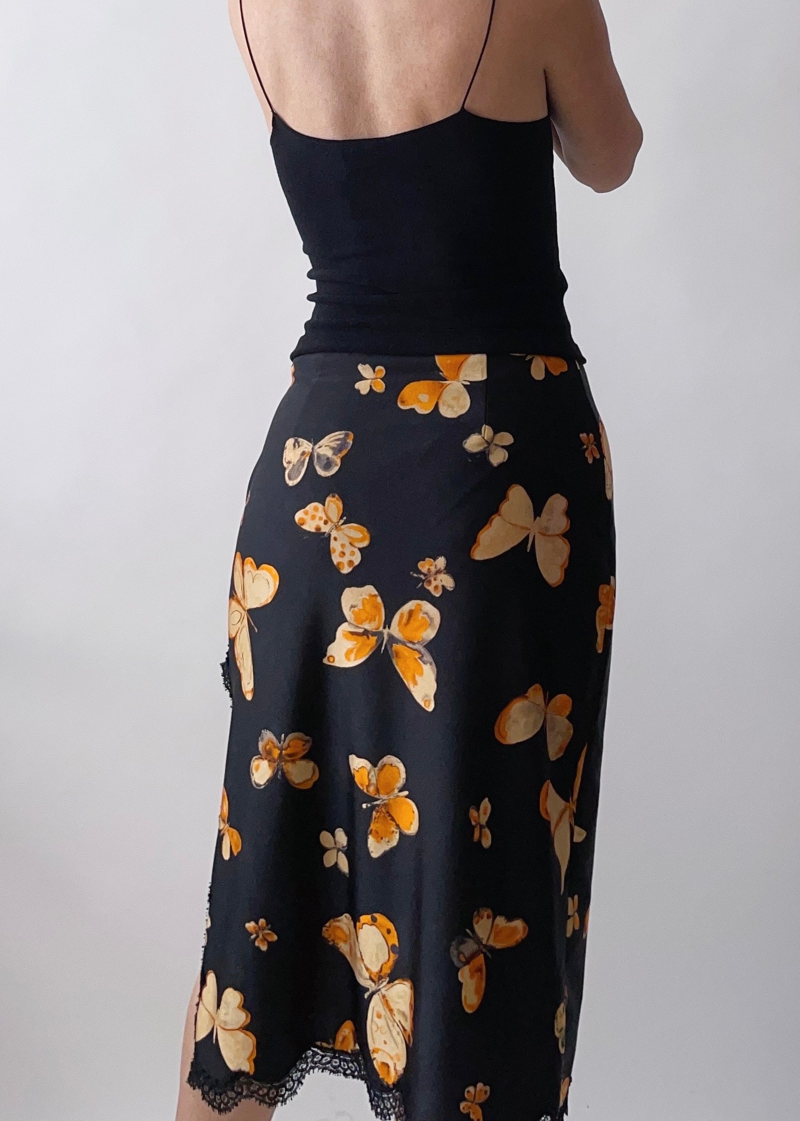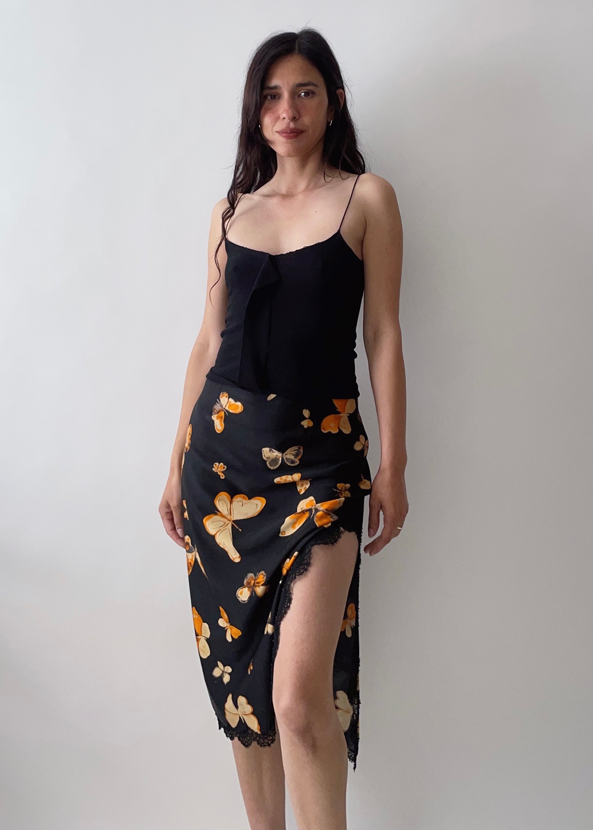 A beautiful butterfly print skirt by Anna Molinari from the 90s. It features lace trimming and a side slit.