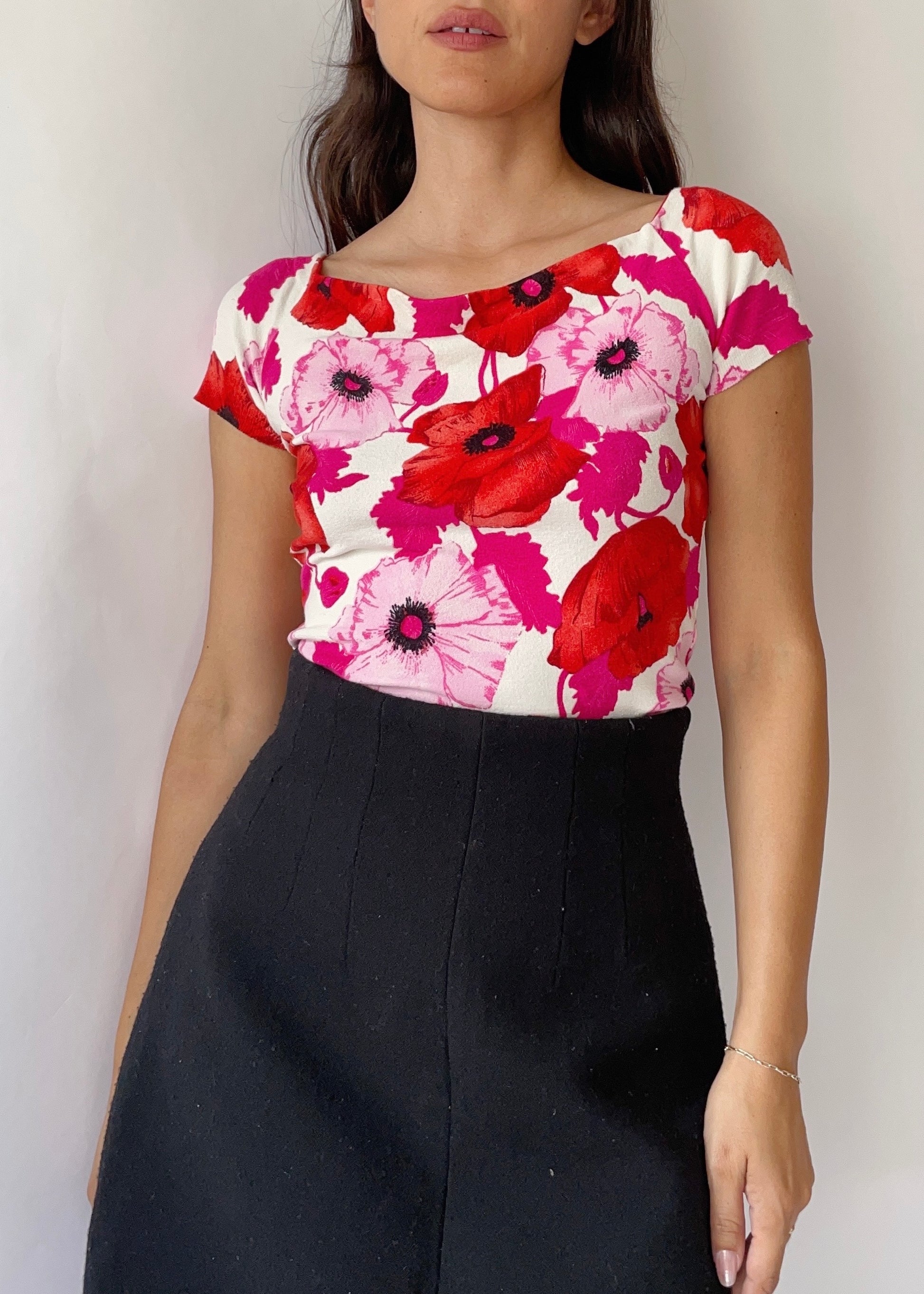 Beautiful Blumarine poppy knit top from the 1990s. It features a cropped silhouette and a slight shoulder baring with cap sleeves.