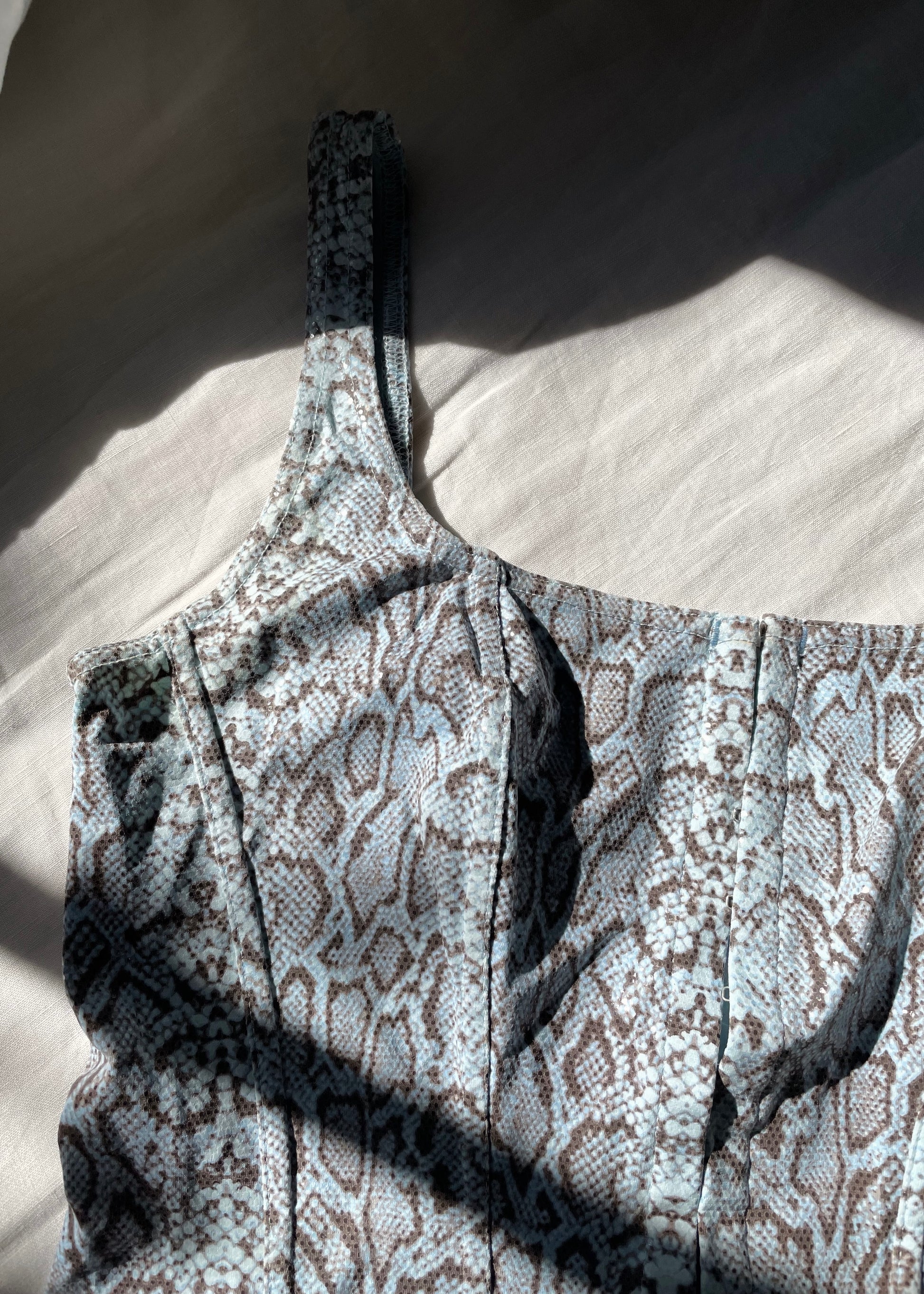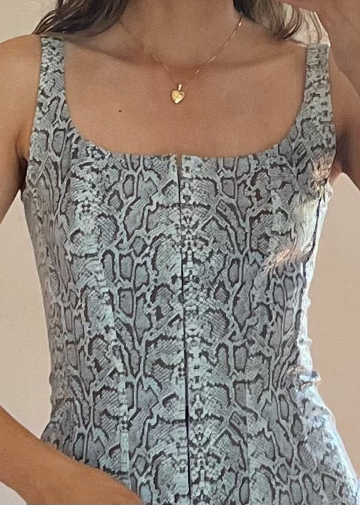 Beautiful 90s Anti-flirt bustier tank in a blue snake print. The fit is so flattering and material has some give to hug your body.