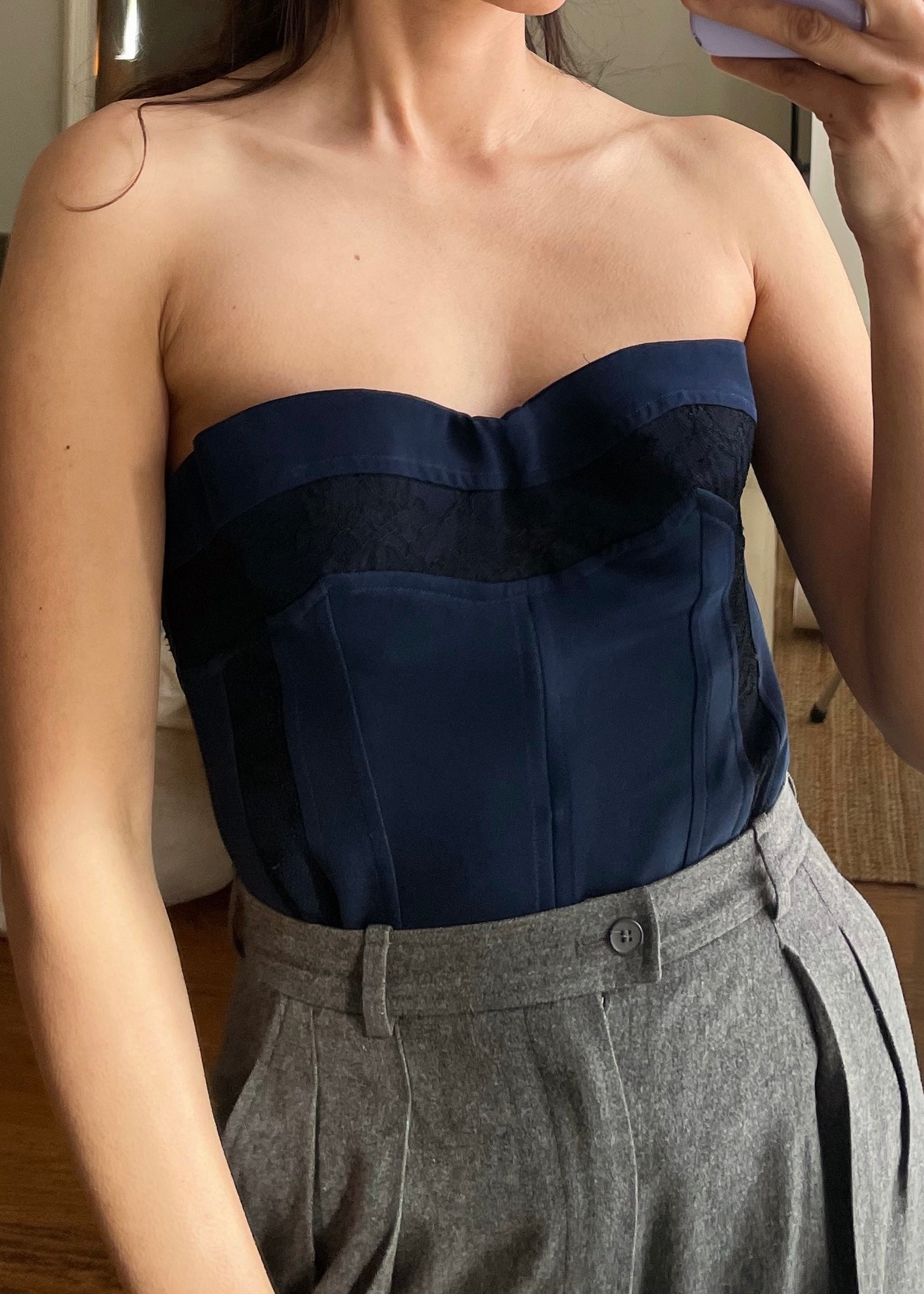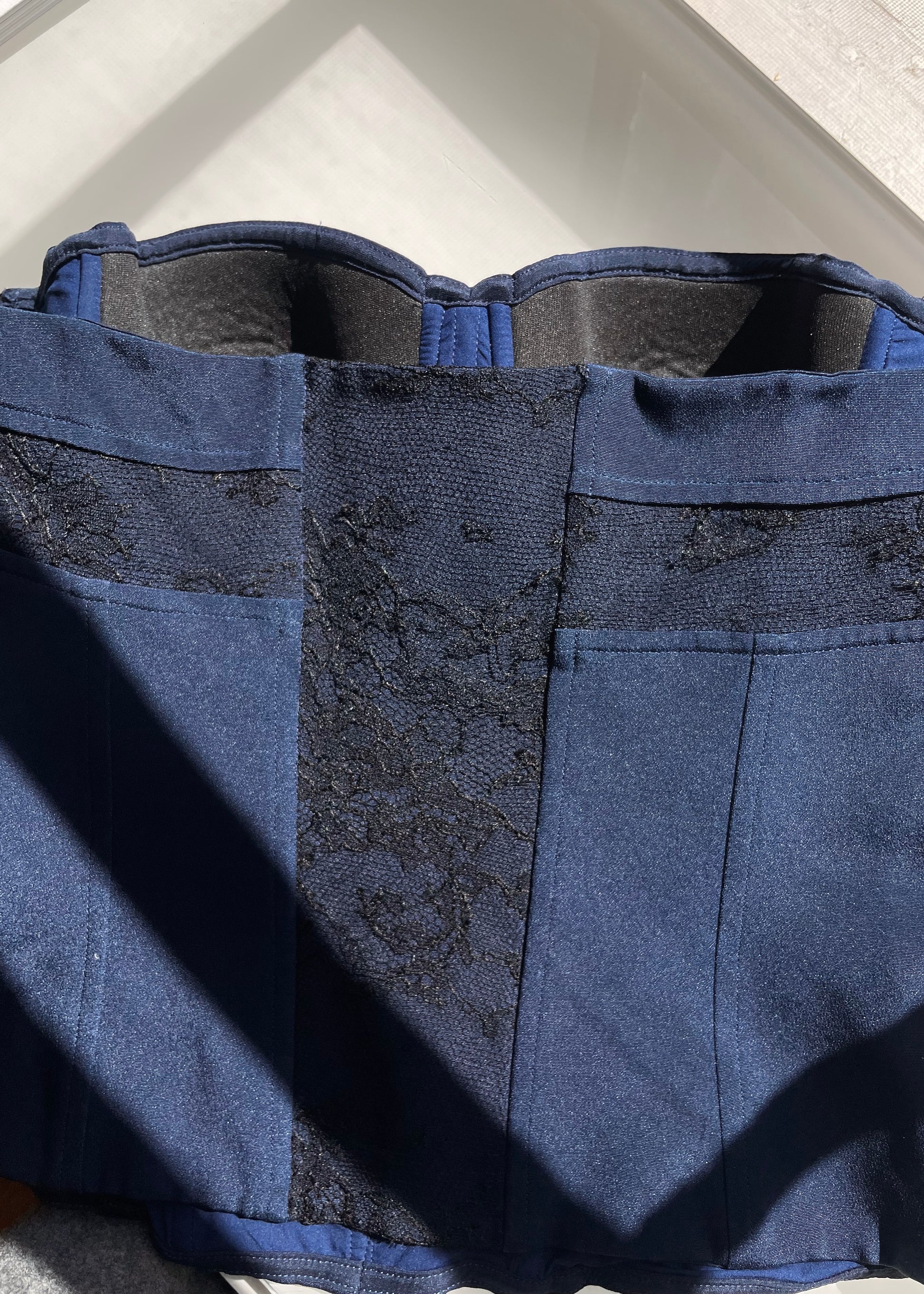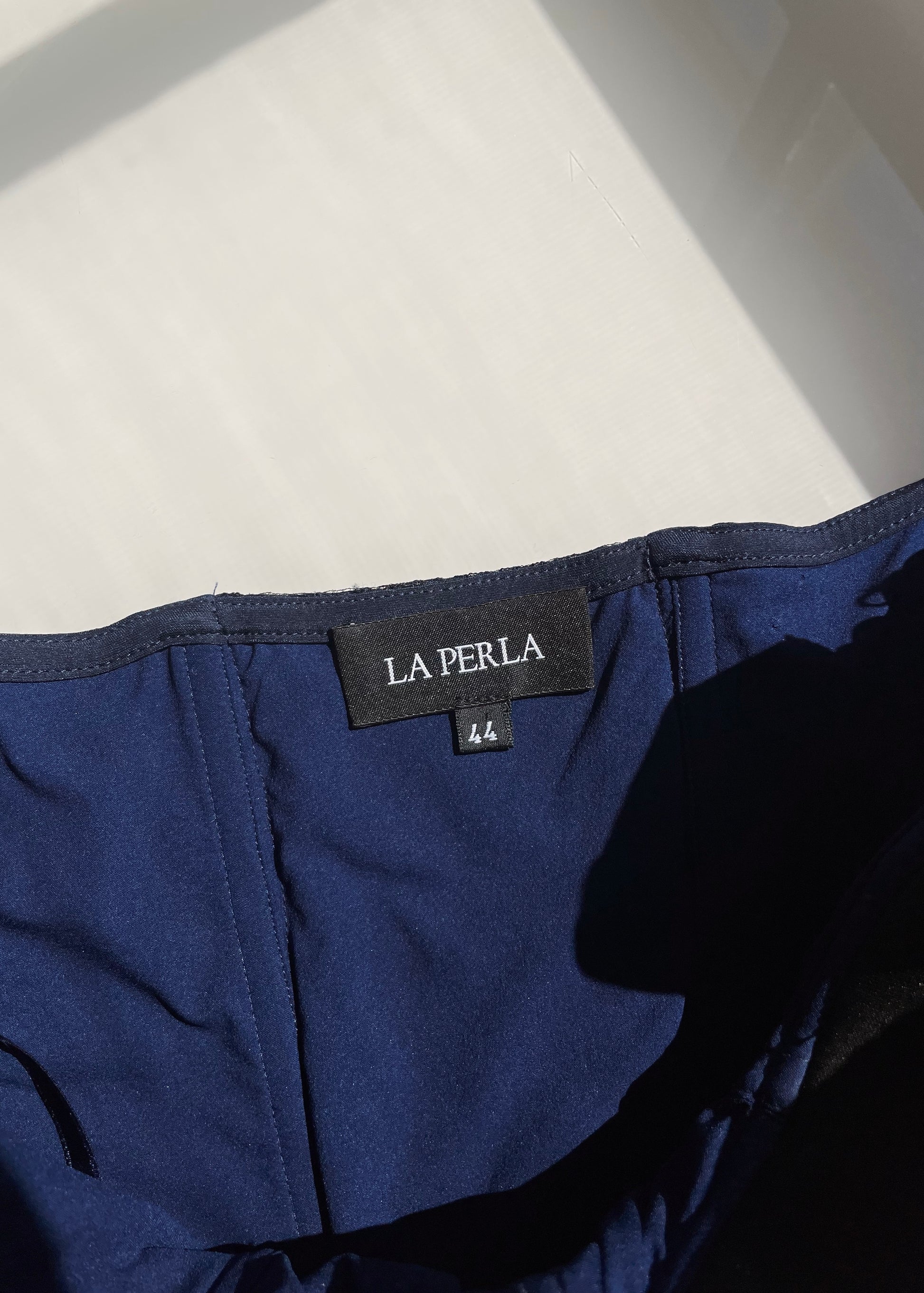 Beautiful vintage La Perla silk bustier in navy with black lace trimming all around. Boning to form a flattering fit. From the 1990s.