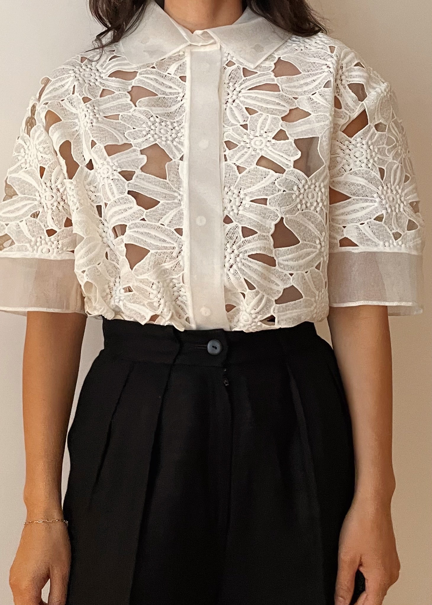 Stunning Blumarine cut-out blouse with a gorgeous organza collar and hems. From the Blugirl line. Made in Italy.