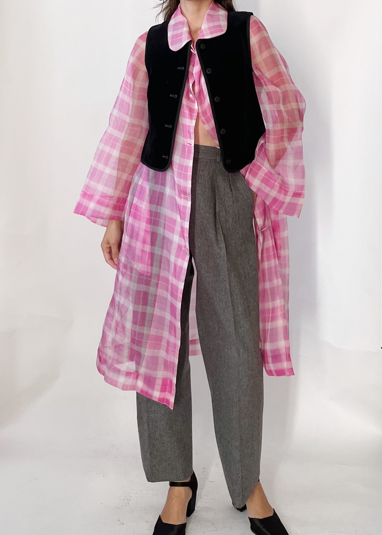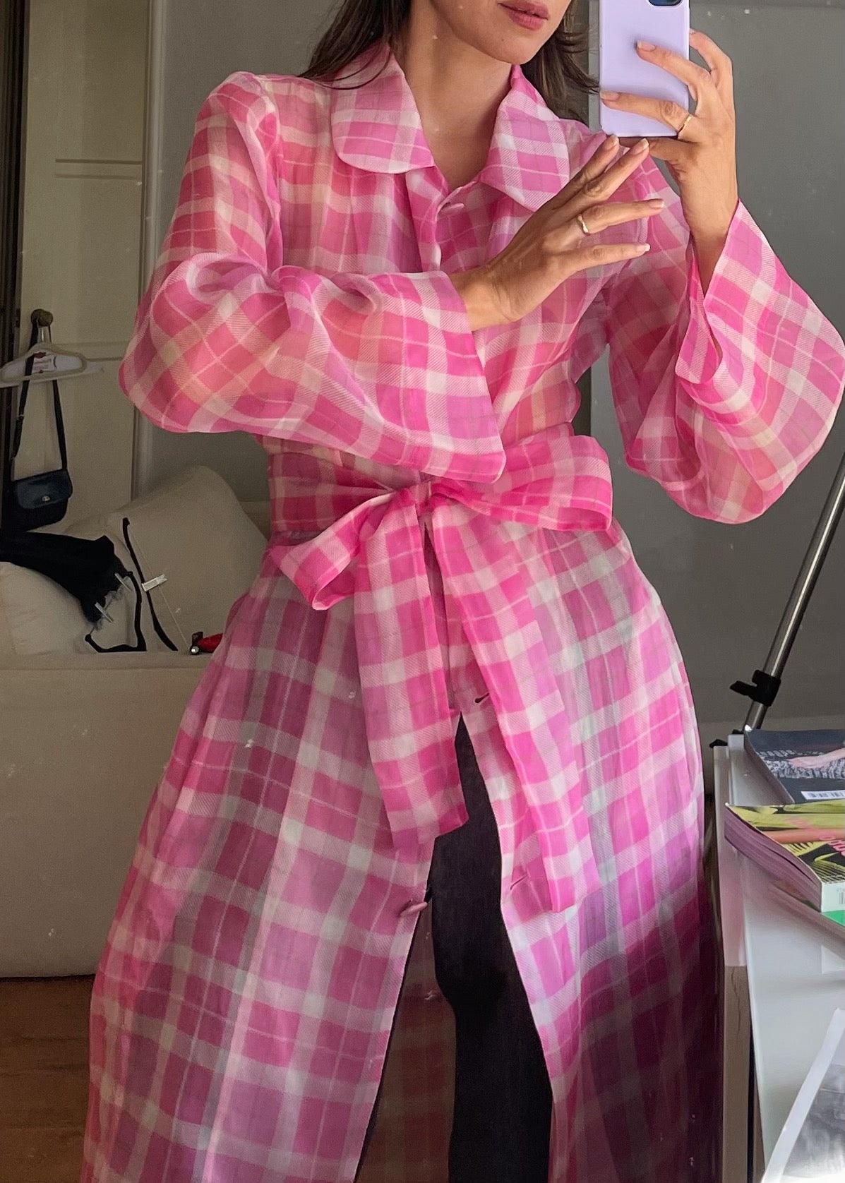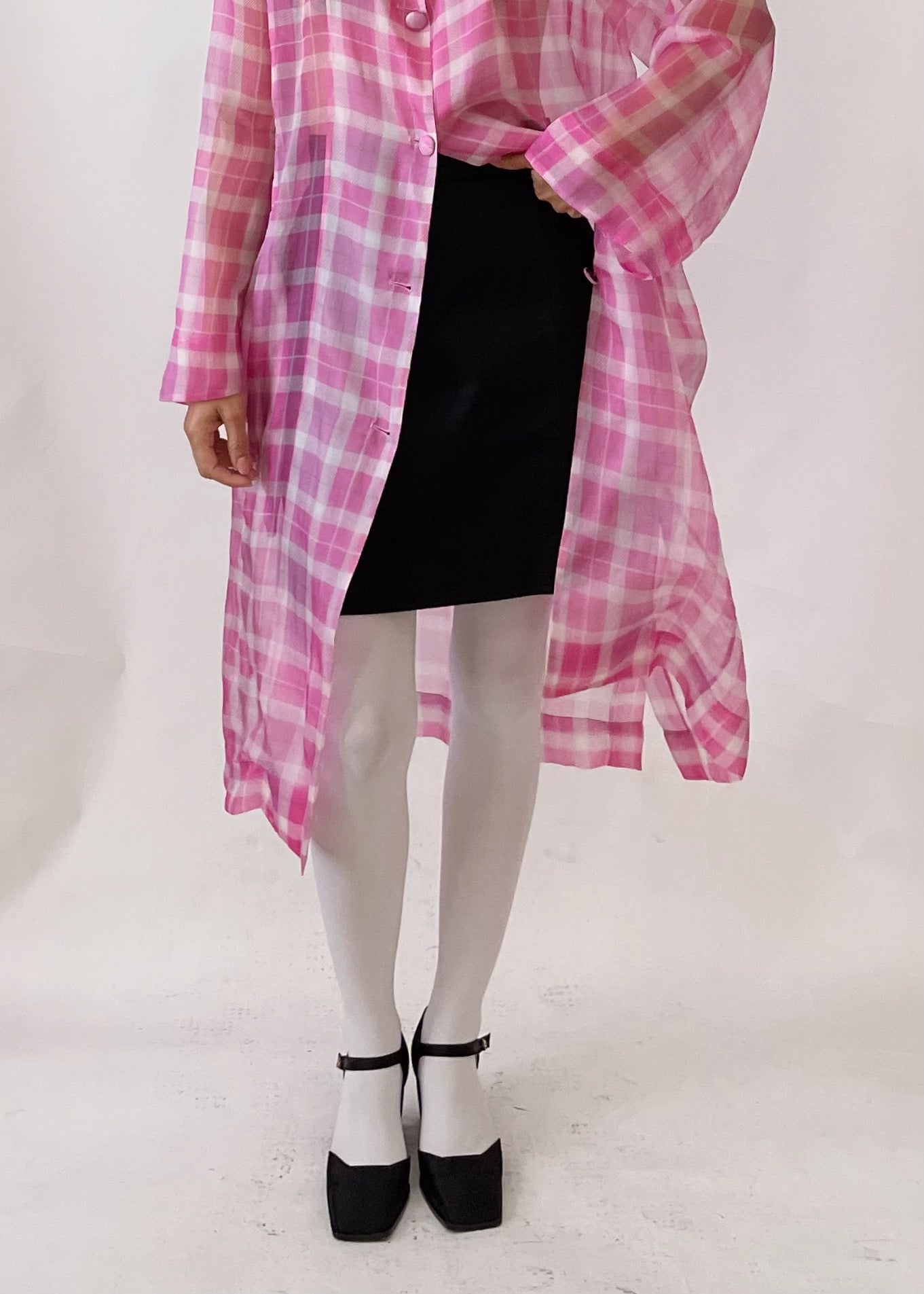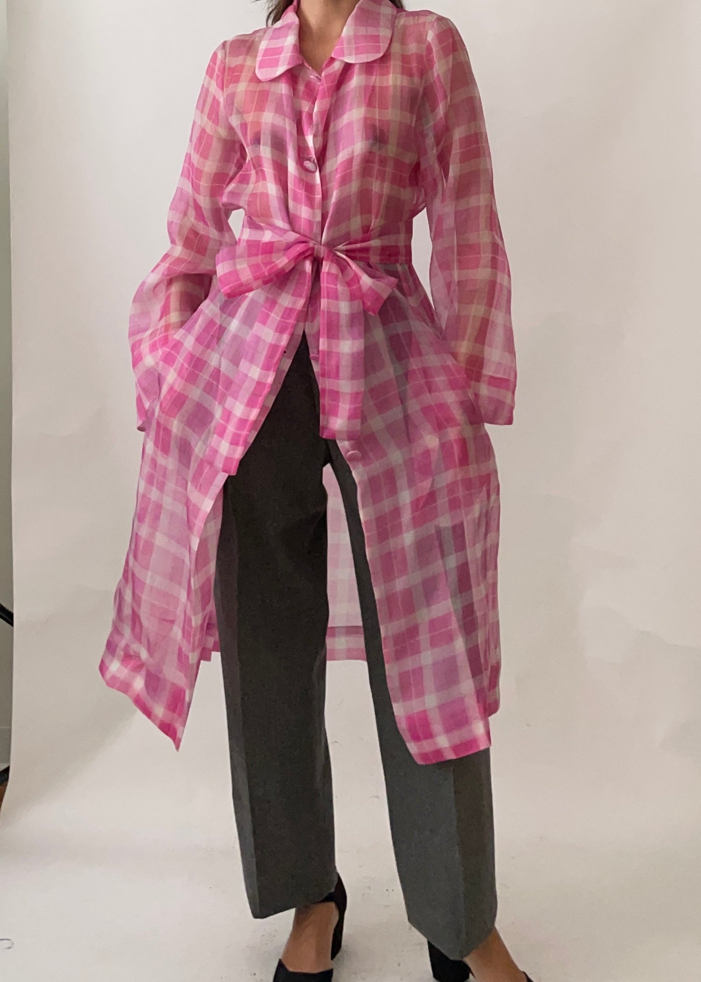 A timeless and beautiful Blumarine silk piece that can be worn as a dress or a layered coat. It features a plaid pattern, two side pockets, with fabric-covered buttons.