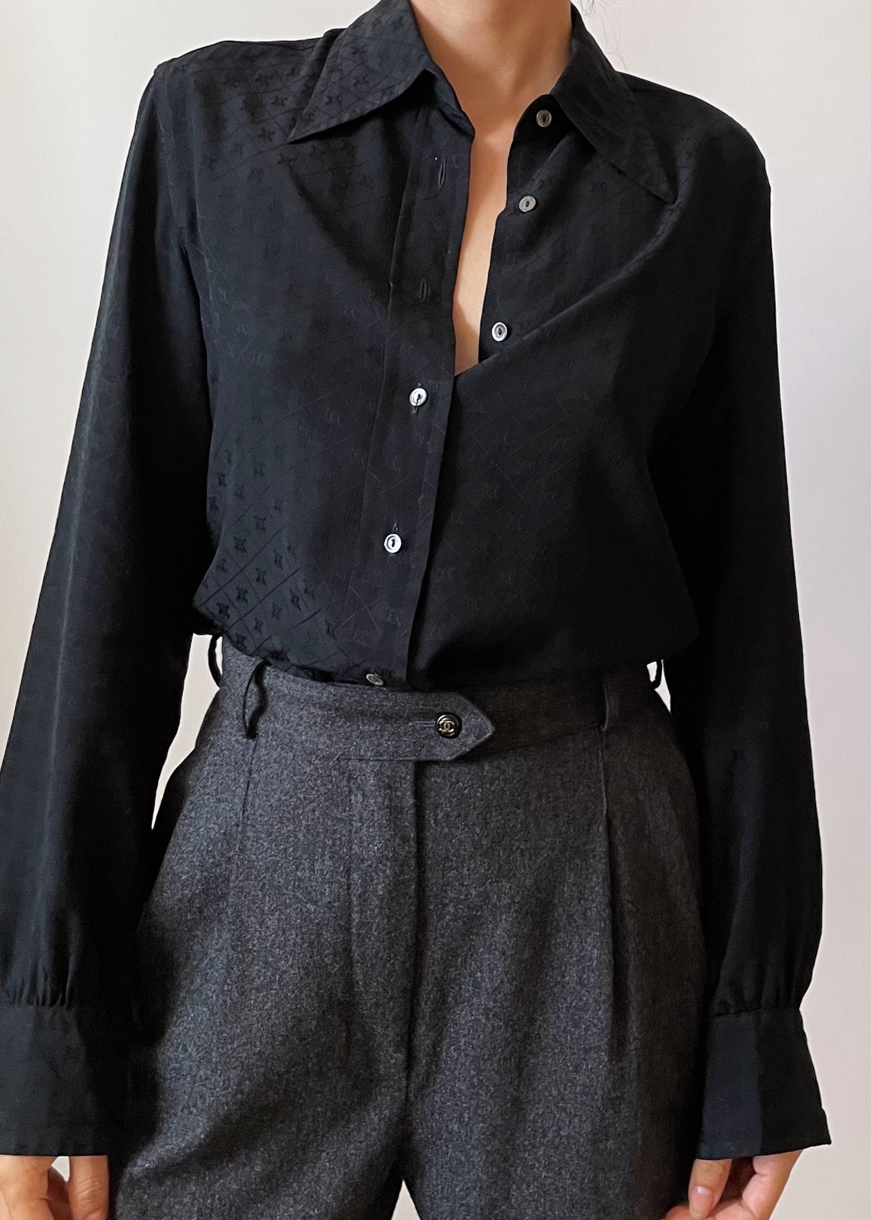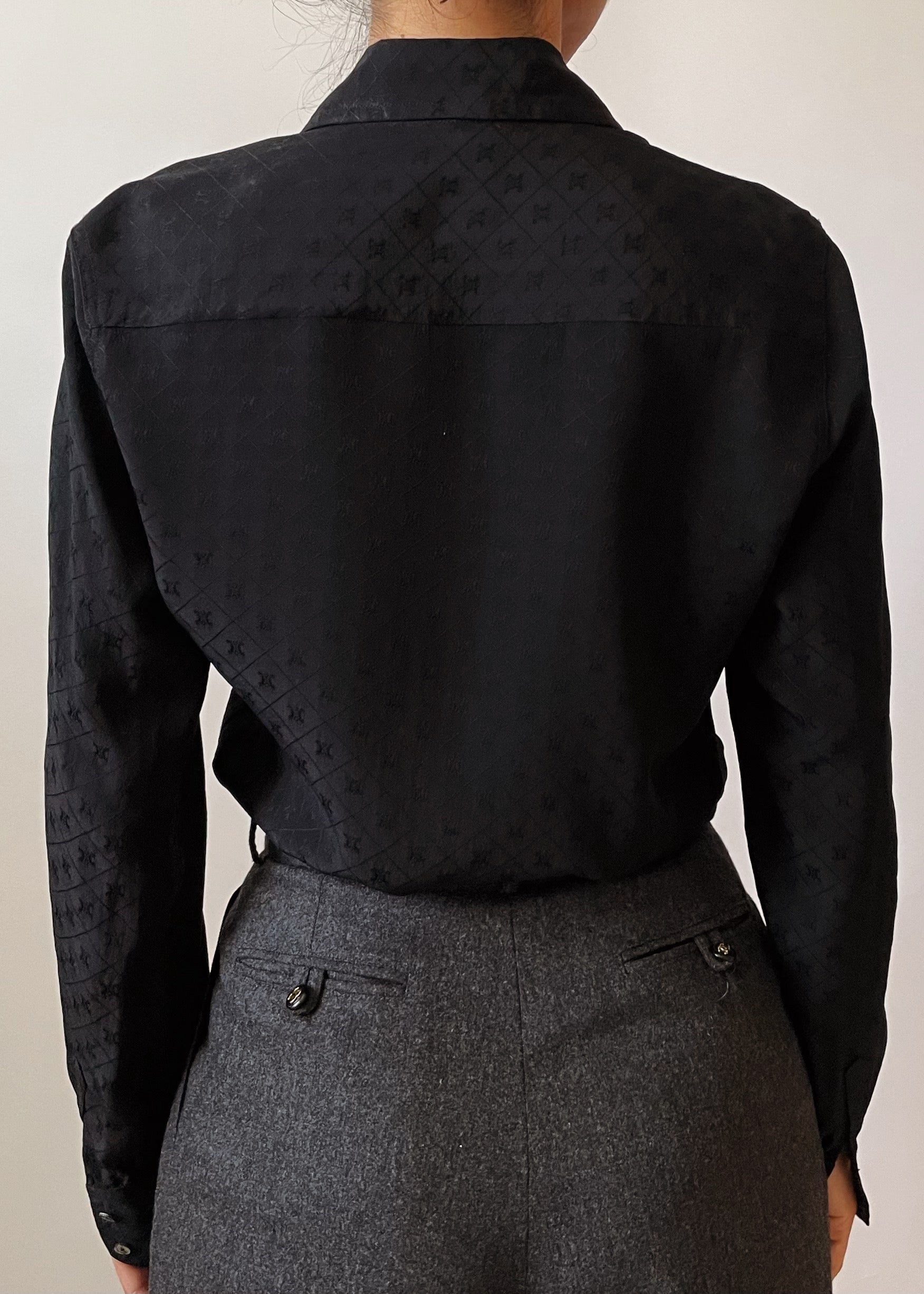 Timeless black Céline silk blouse with iconic monogram all around. From the 1970s and in gorgeous condition.