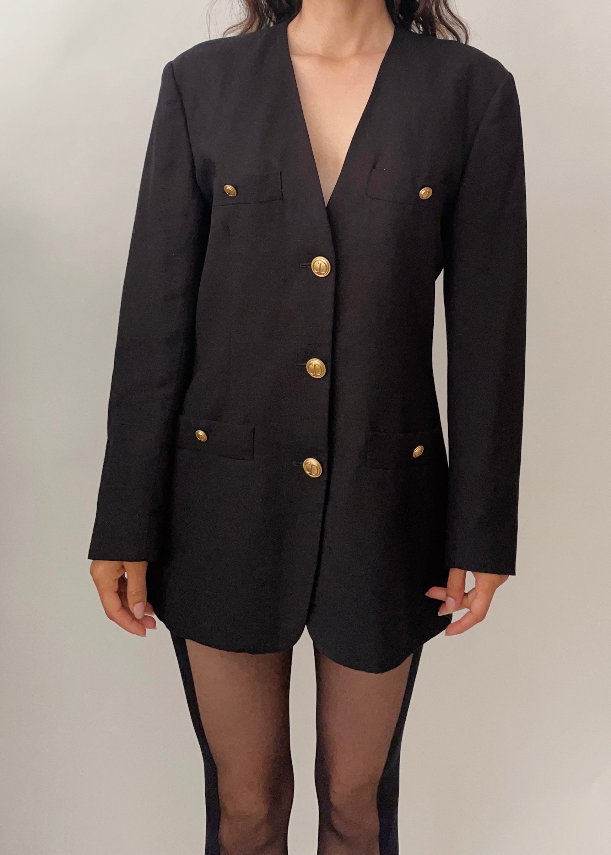 ]This vintaged Christian Dior initials jacket is both a staple and a statement. It features "CD" gold-toned buttons on front and on sleeves and two front pockets. From the 1980s ready-to-wear line made in the USA.
