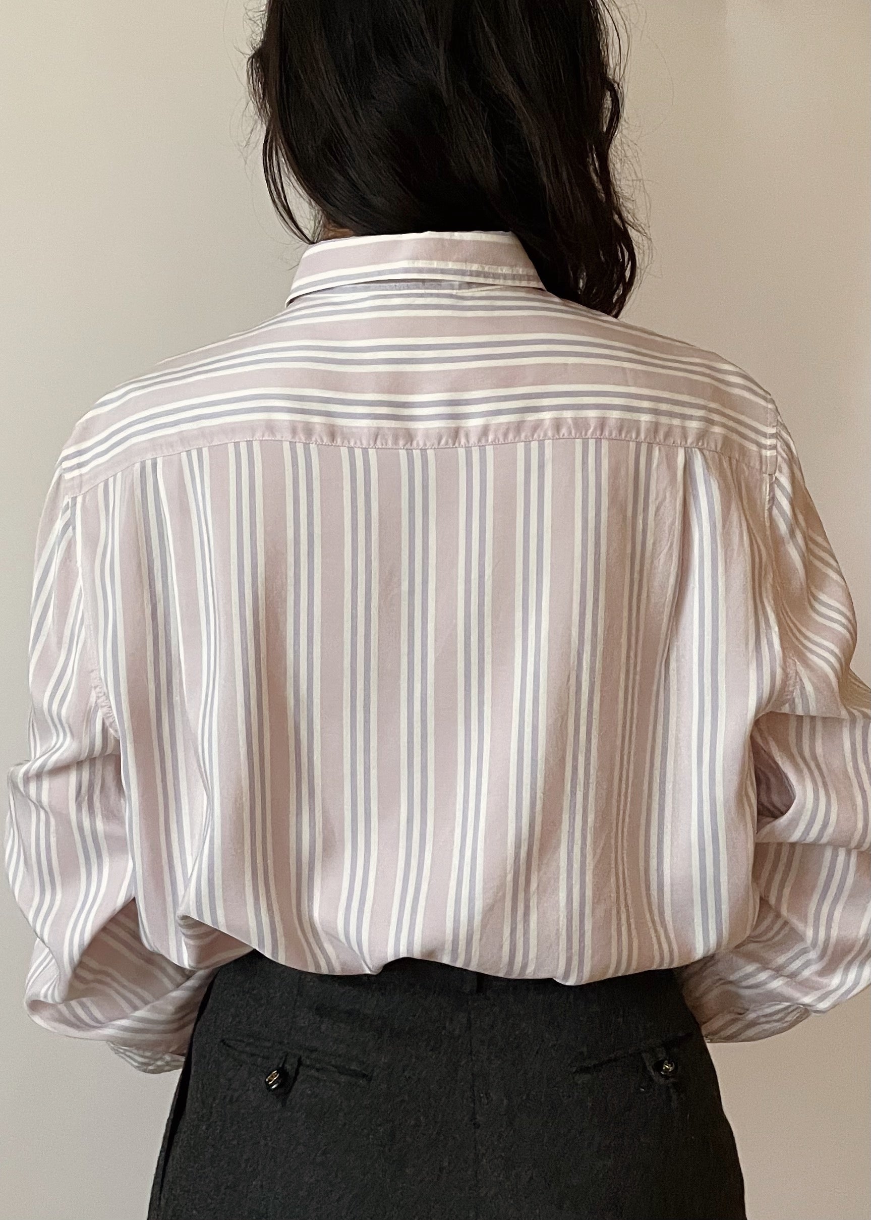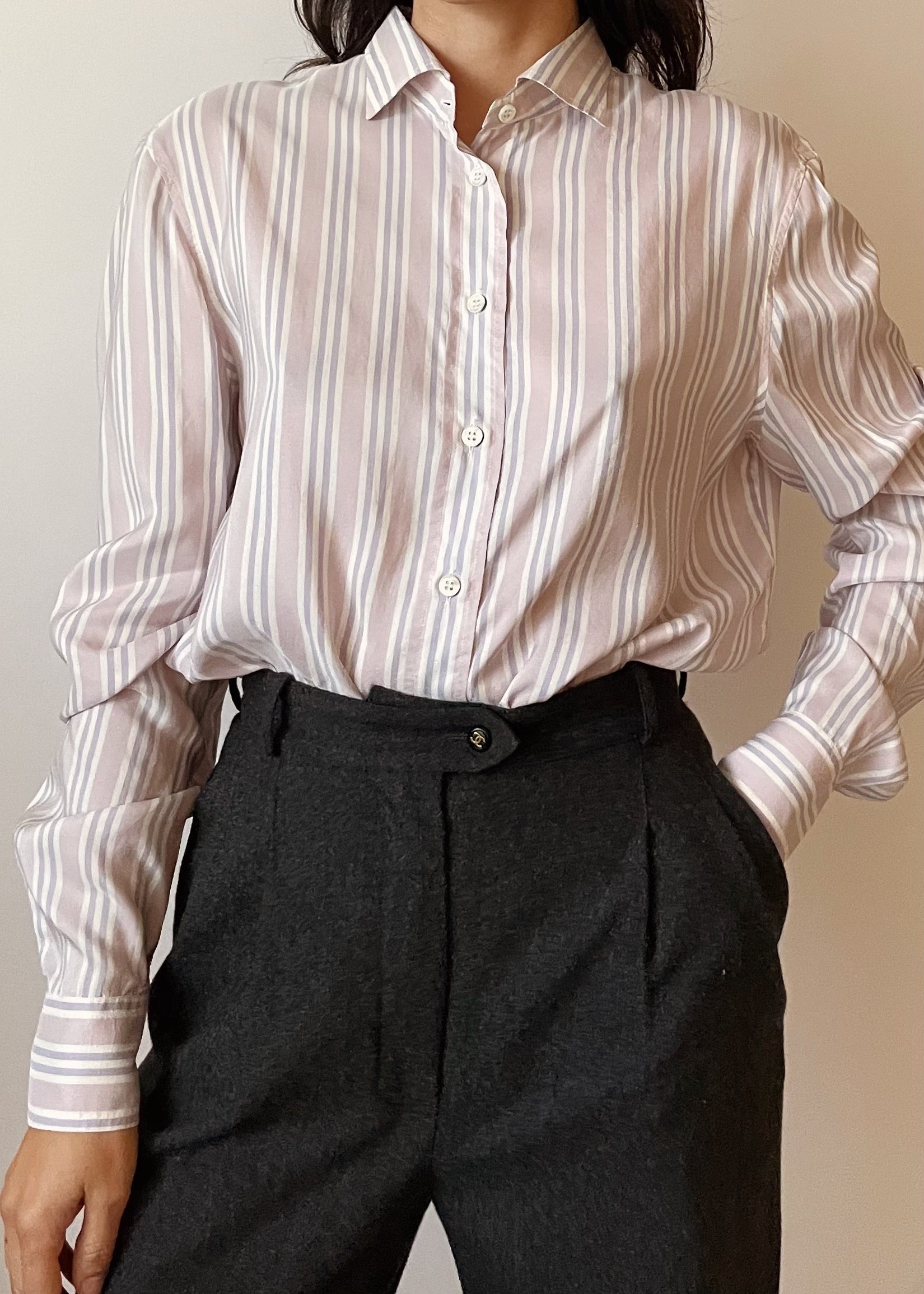 Beautiful and timeless Giorgio Armani striped blouse in a soft silk. It features muted lavender and lilac stripes. Made in Italy.