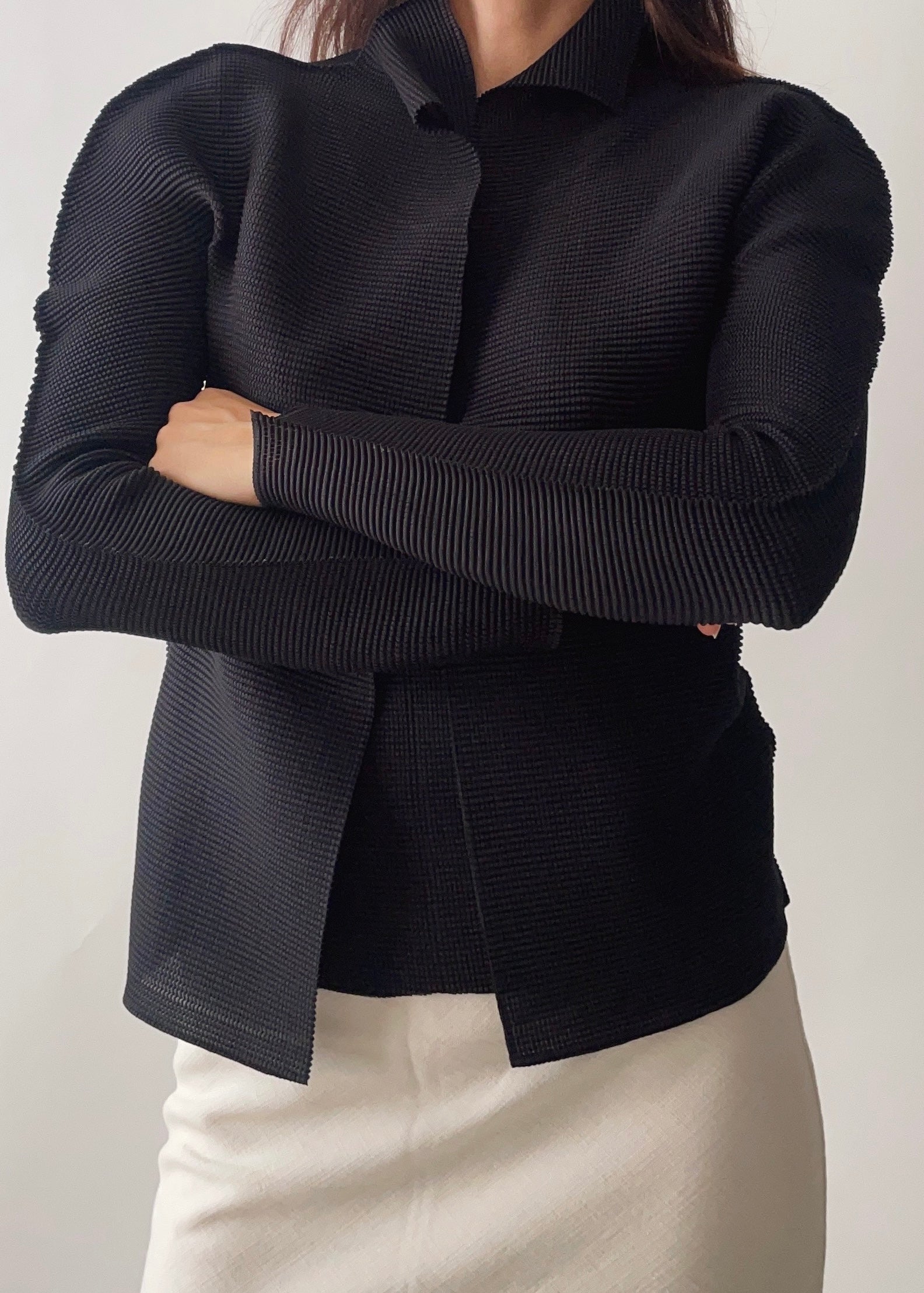 A unique Issey Miyake cardi and cami set thst is sewn together. It features structural sleeves and a high neck. From the Me collection.