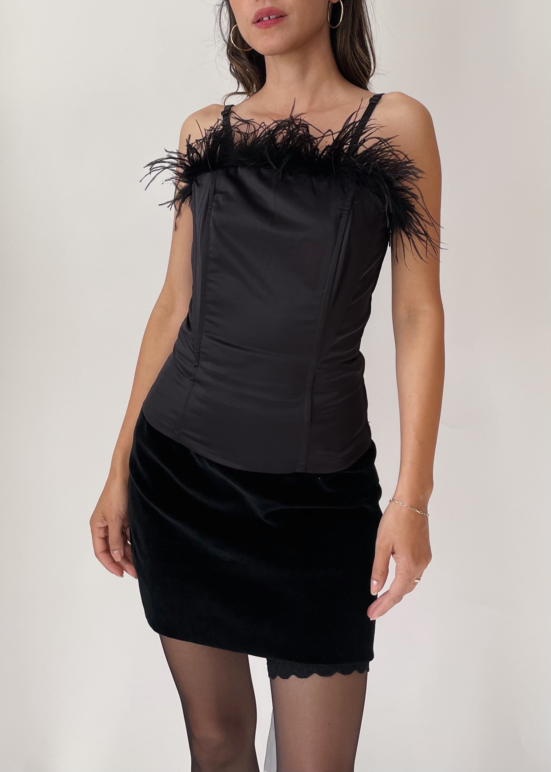 Gorgeous Italian faux feather bustier top with organza lace fastening on back. It features bustier boning all around.