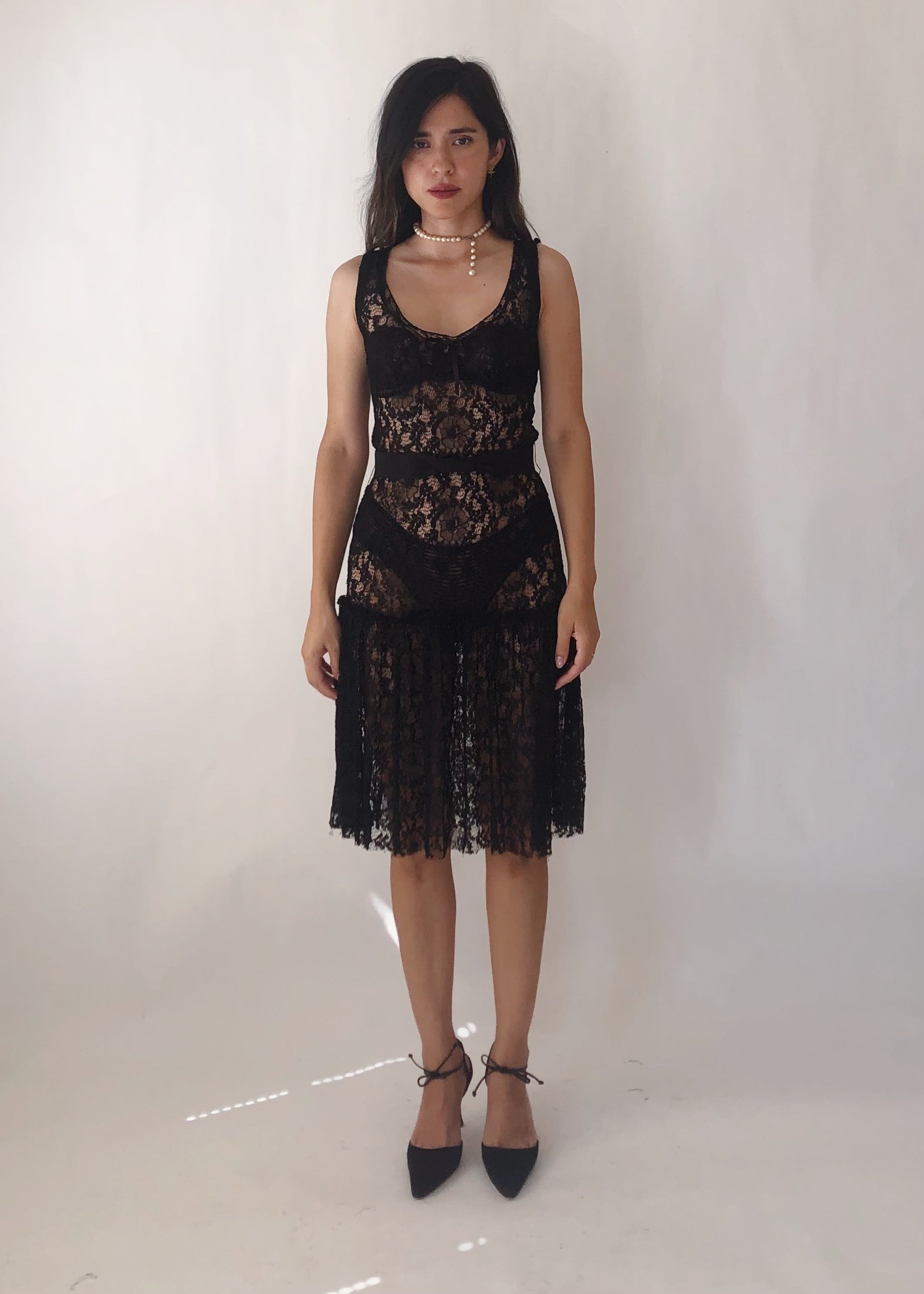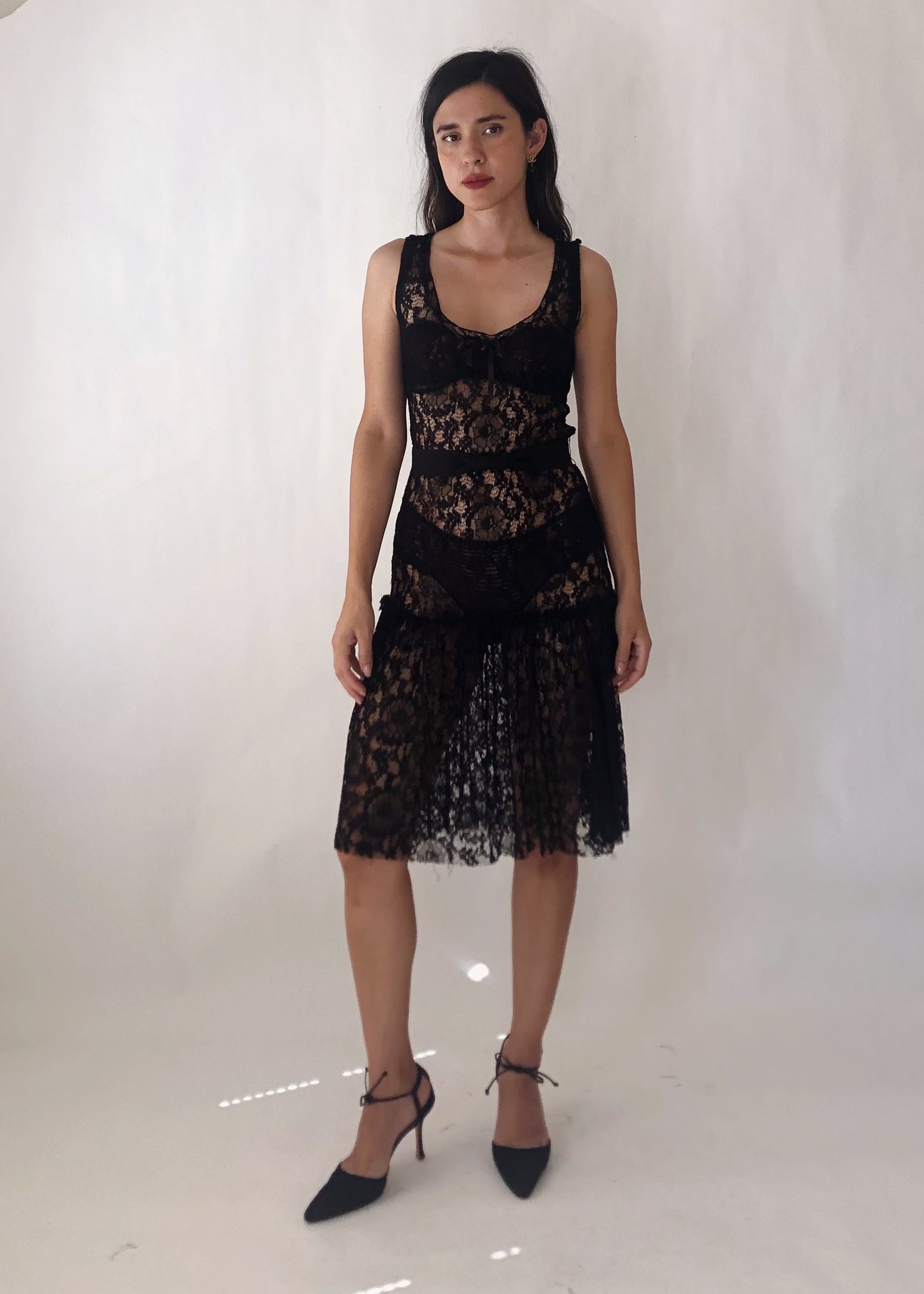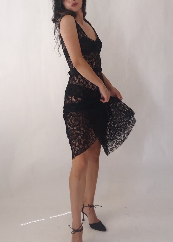 Stunning Moschino black floral lace dress with detachable belt. It features a black ribbon around the neckline that ties into a bow. A sexy and classic piece. No slip included.