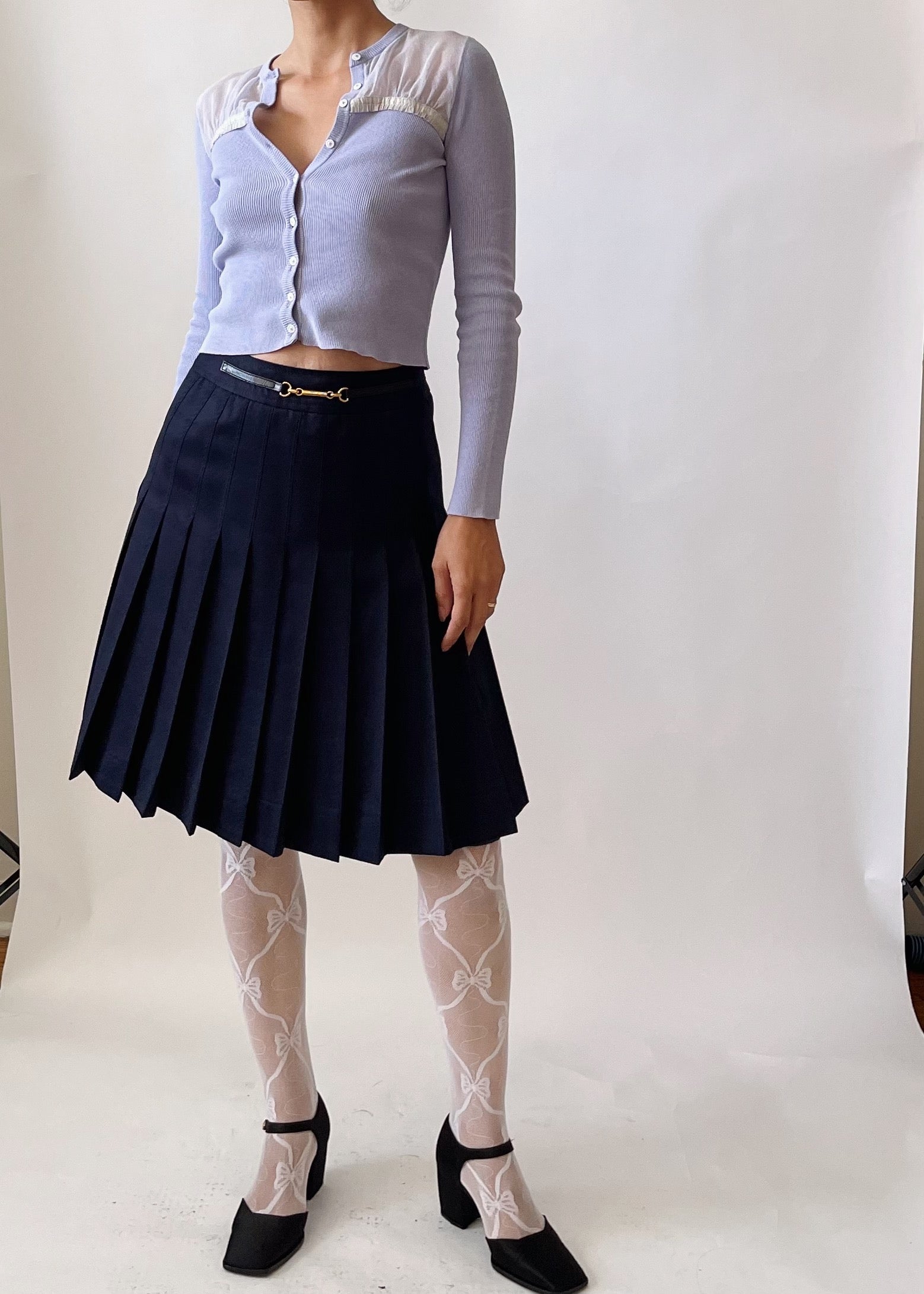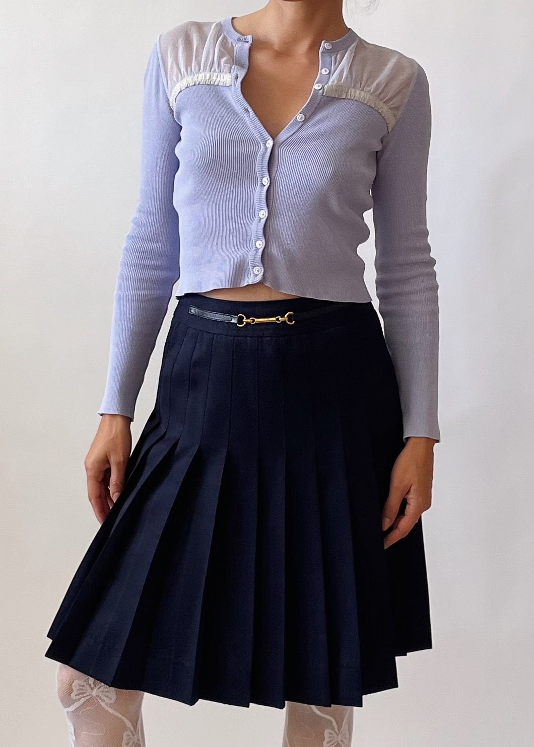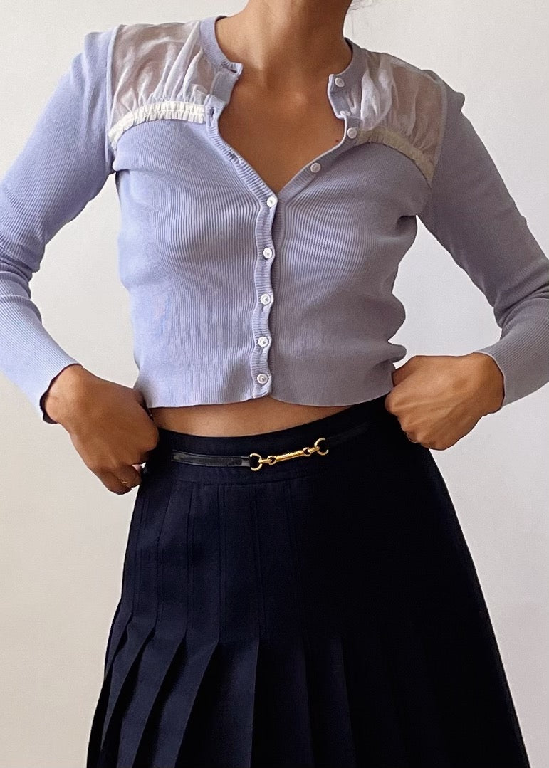 Moschino knit cardigan in a beautiful lavender. It features dreamy white lace front details.
