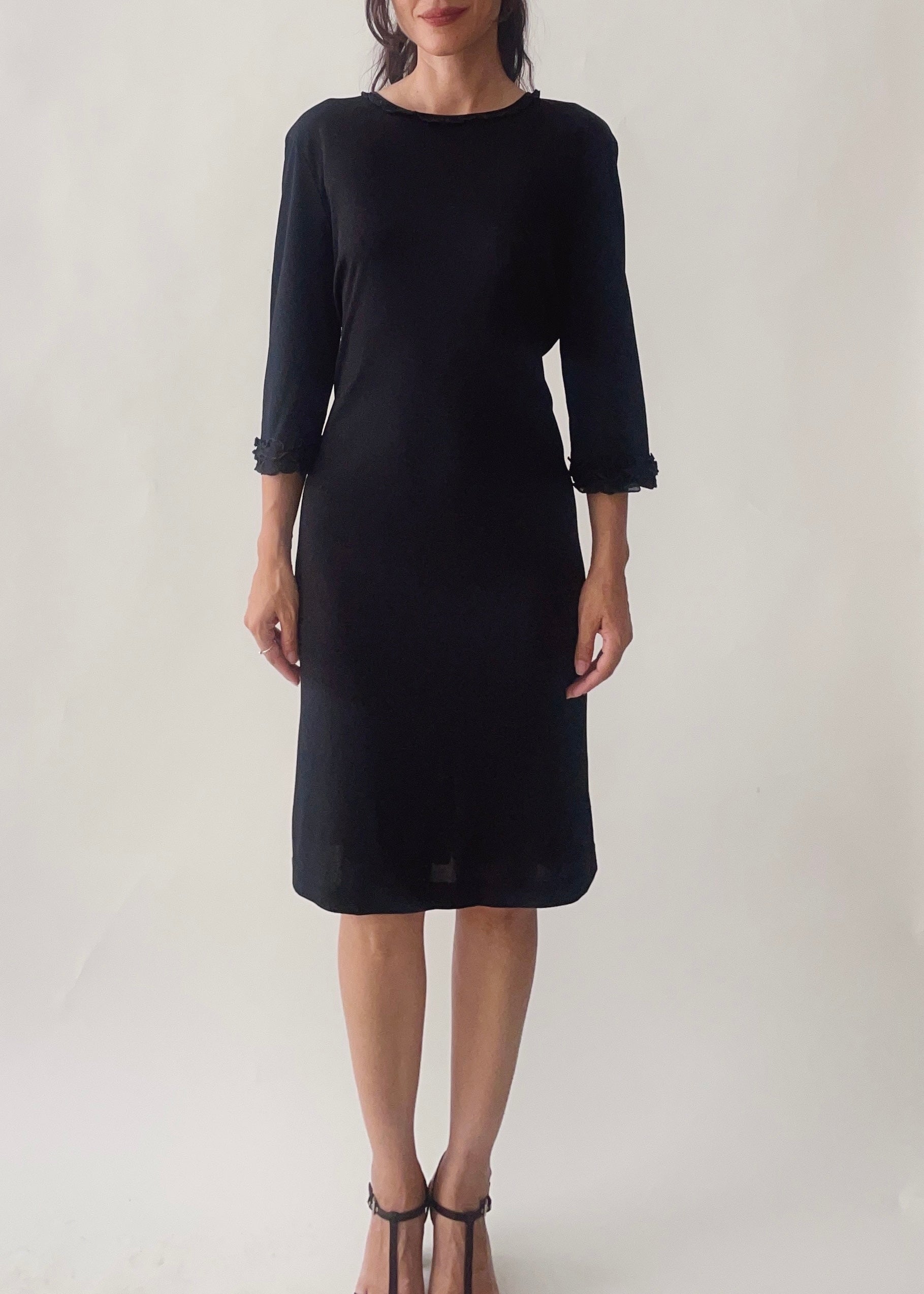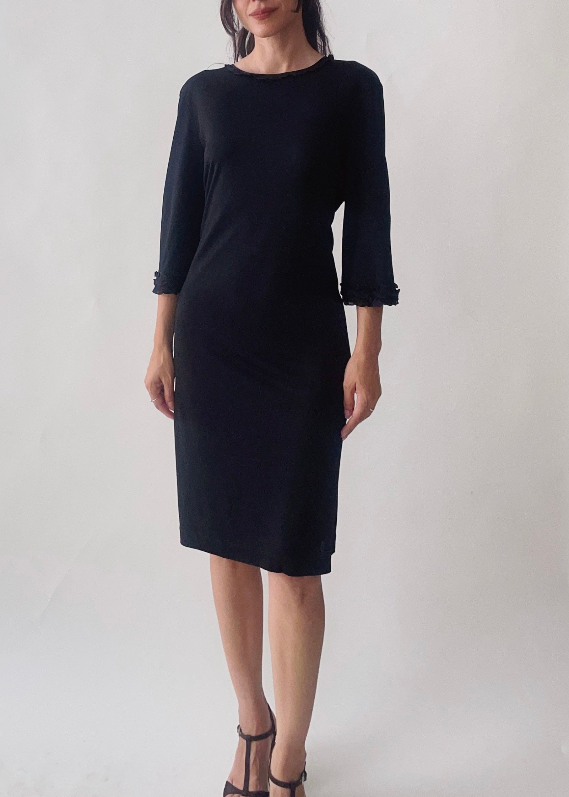 Another vintage beauty by Moschino with the perfect peek-a-boo back with tie closure. It features ruffle details on sleeves and back.