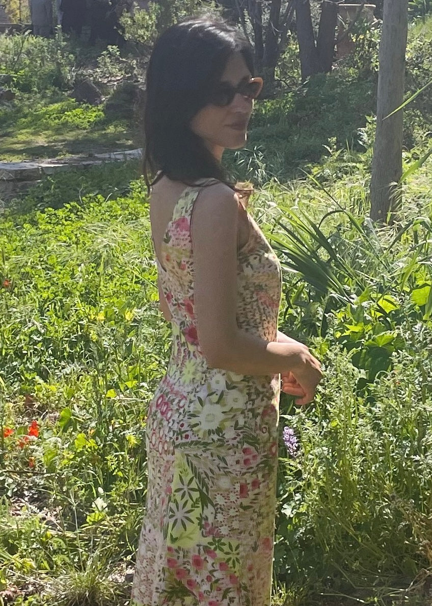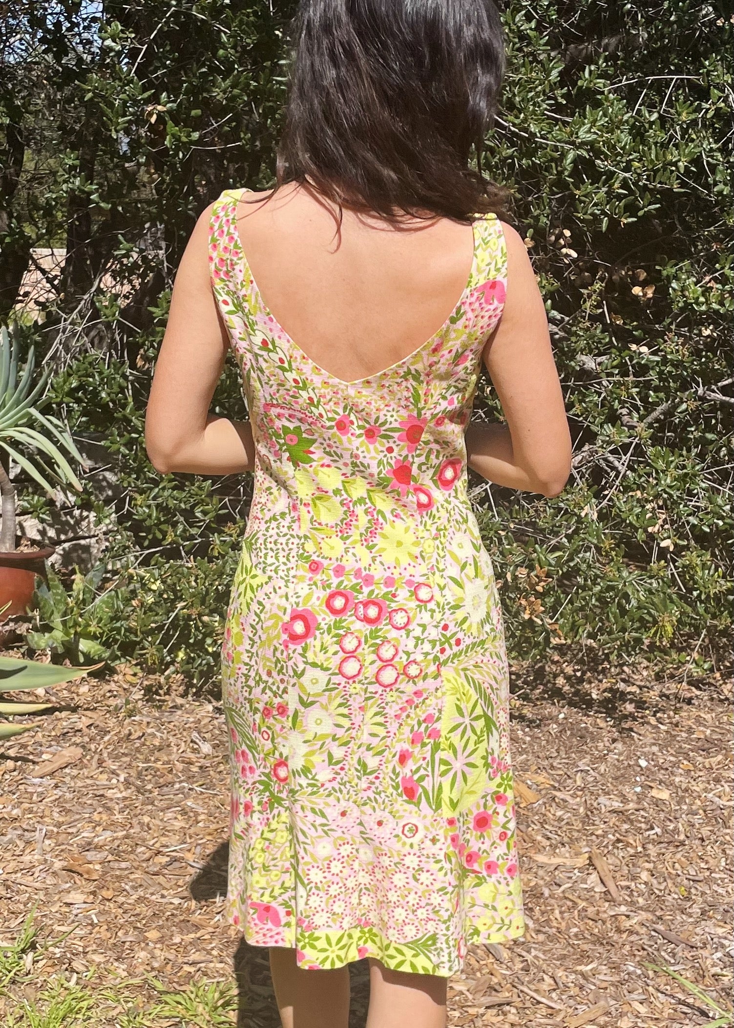 Vintage Moschino spring dress with a beautiful floral and colorful pattern. It features a low back and a form fitting shape. From the Cheap and Chic line.