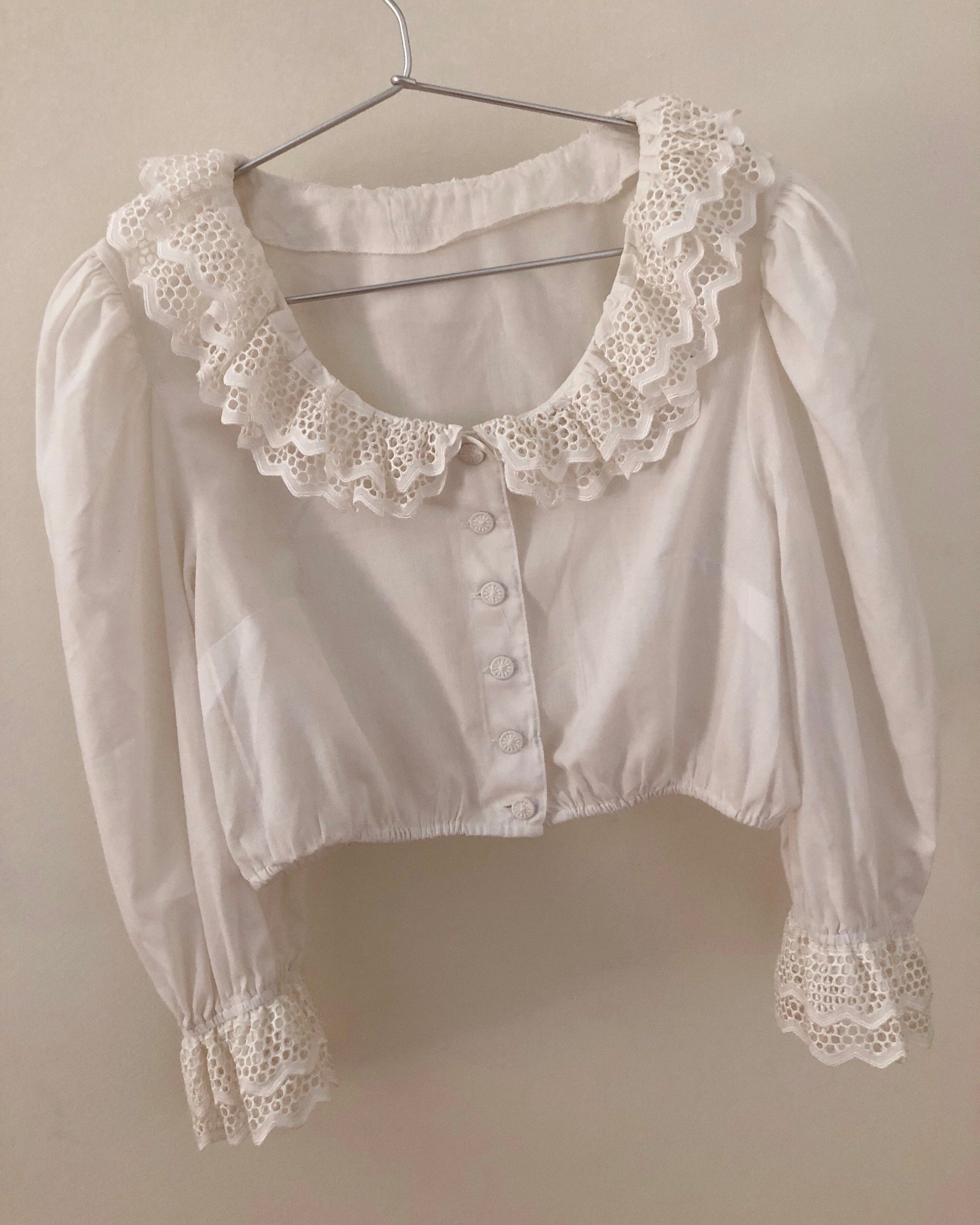 Romantic collar blouse with gorgeous ruffles on neckline and sleeves.