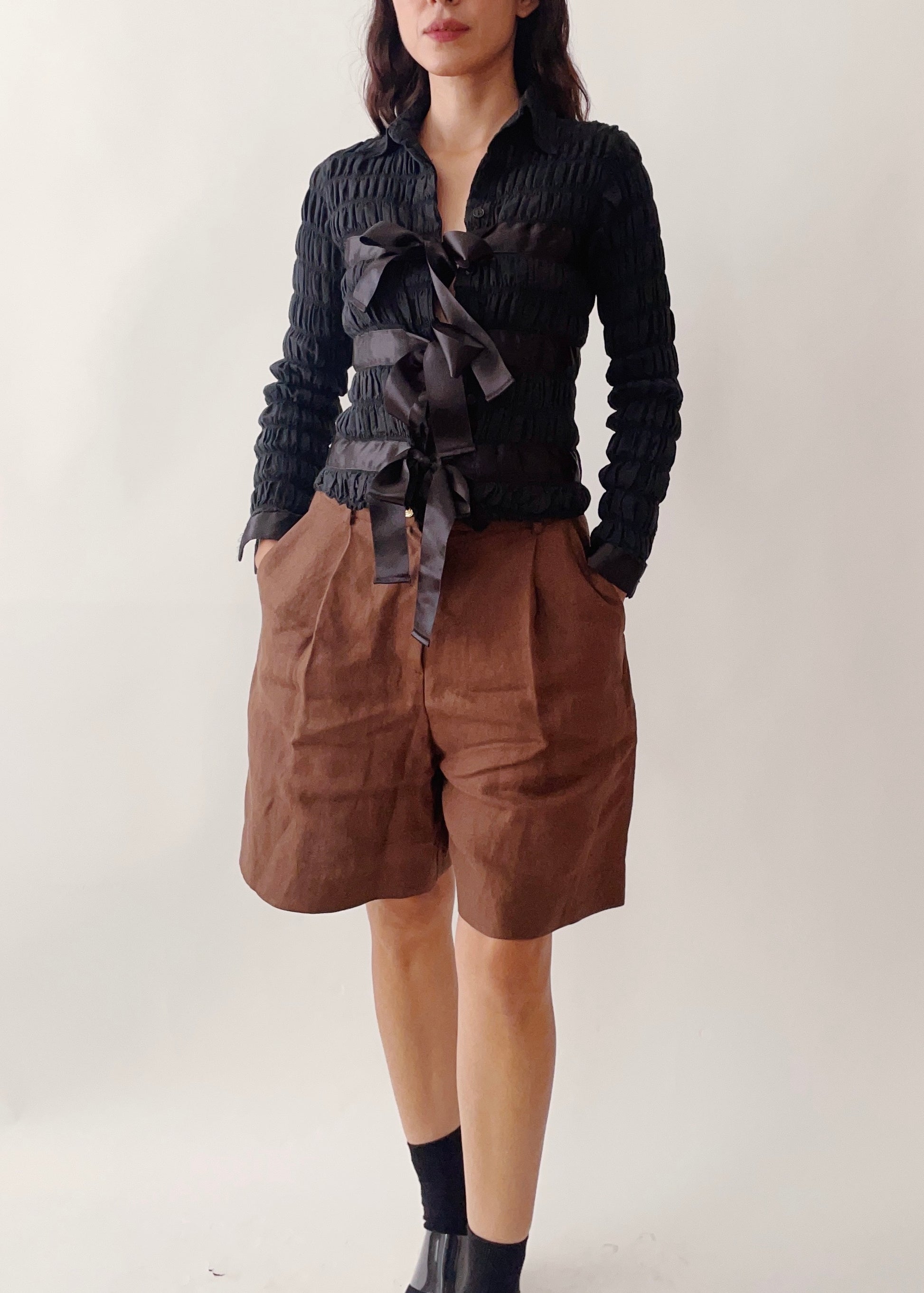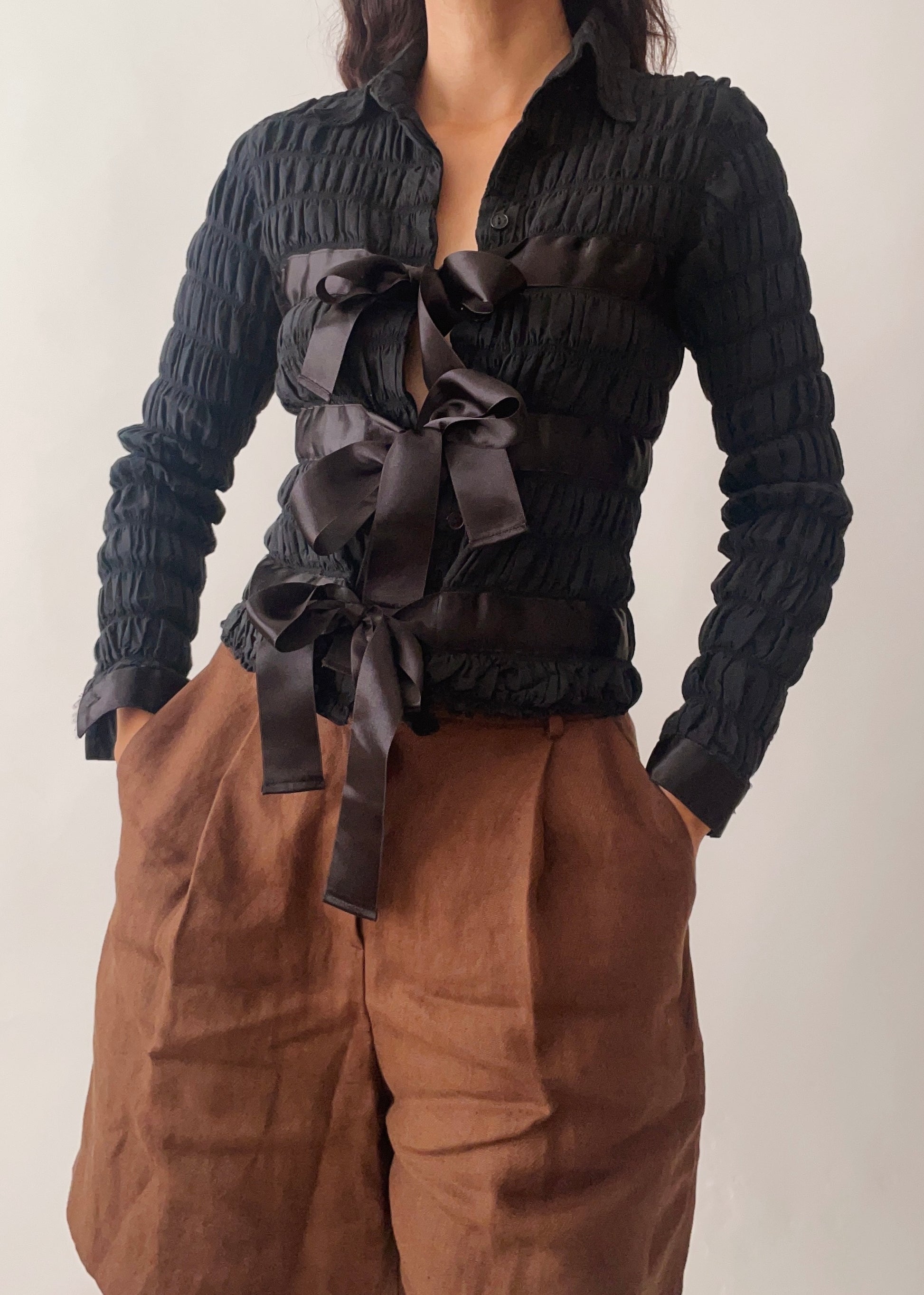 Vintage Anne Fontaine black ruched long sleeve top with three front bows. It features front button closure in addition to bows.