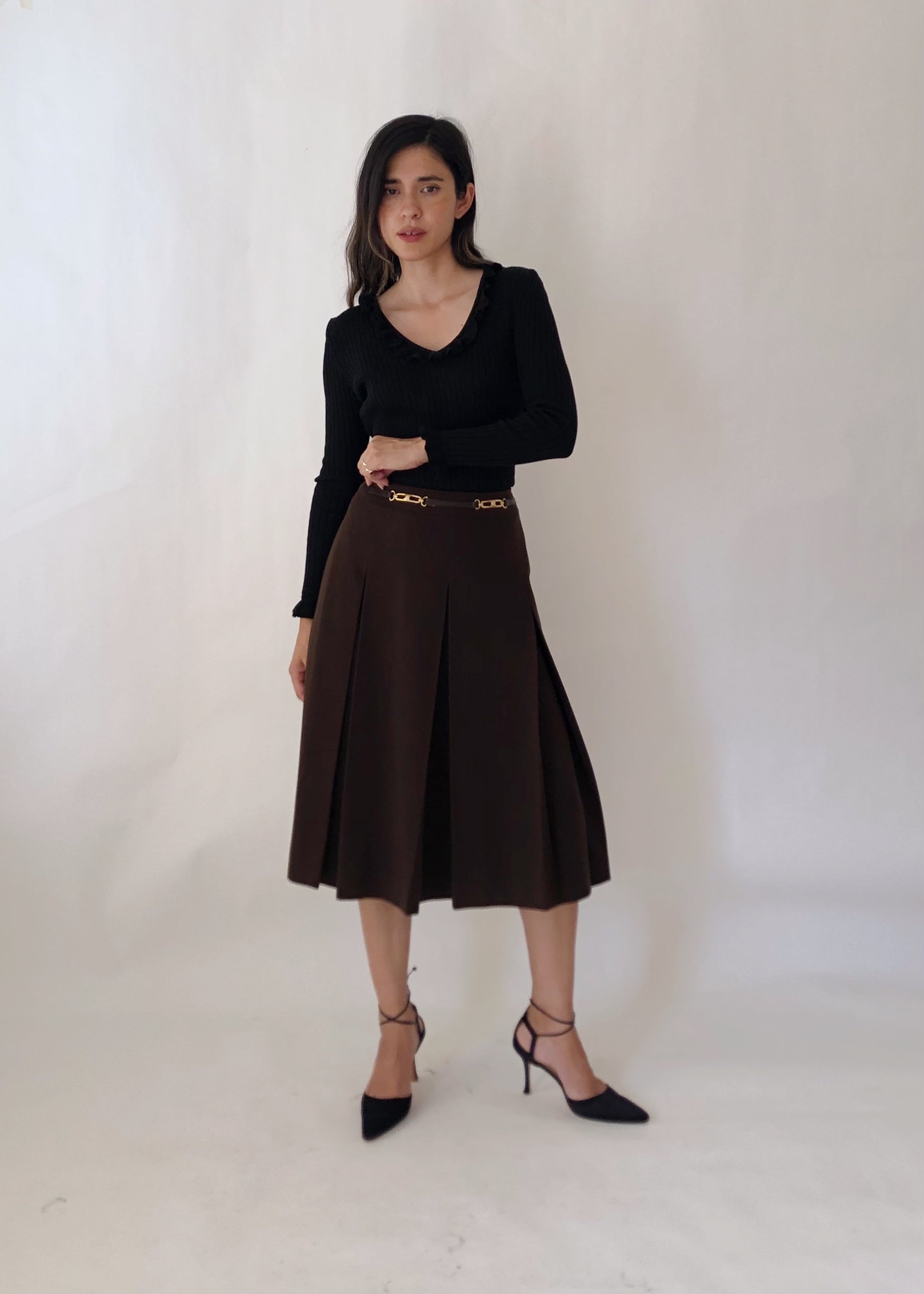 Beautiful vintage Celine wool skirt in a rich brown with a leather and gold belt at waistband. Signature Celine printed lining underneath. A classic A-line pleated skirt for this autumn. From the 1970s.
