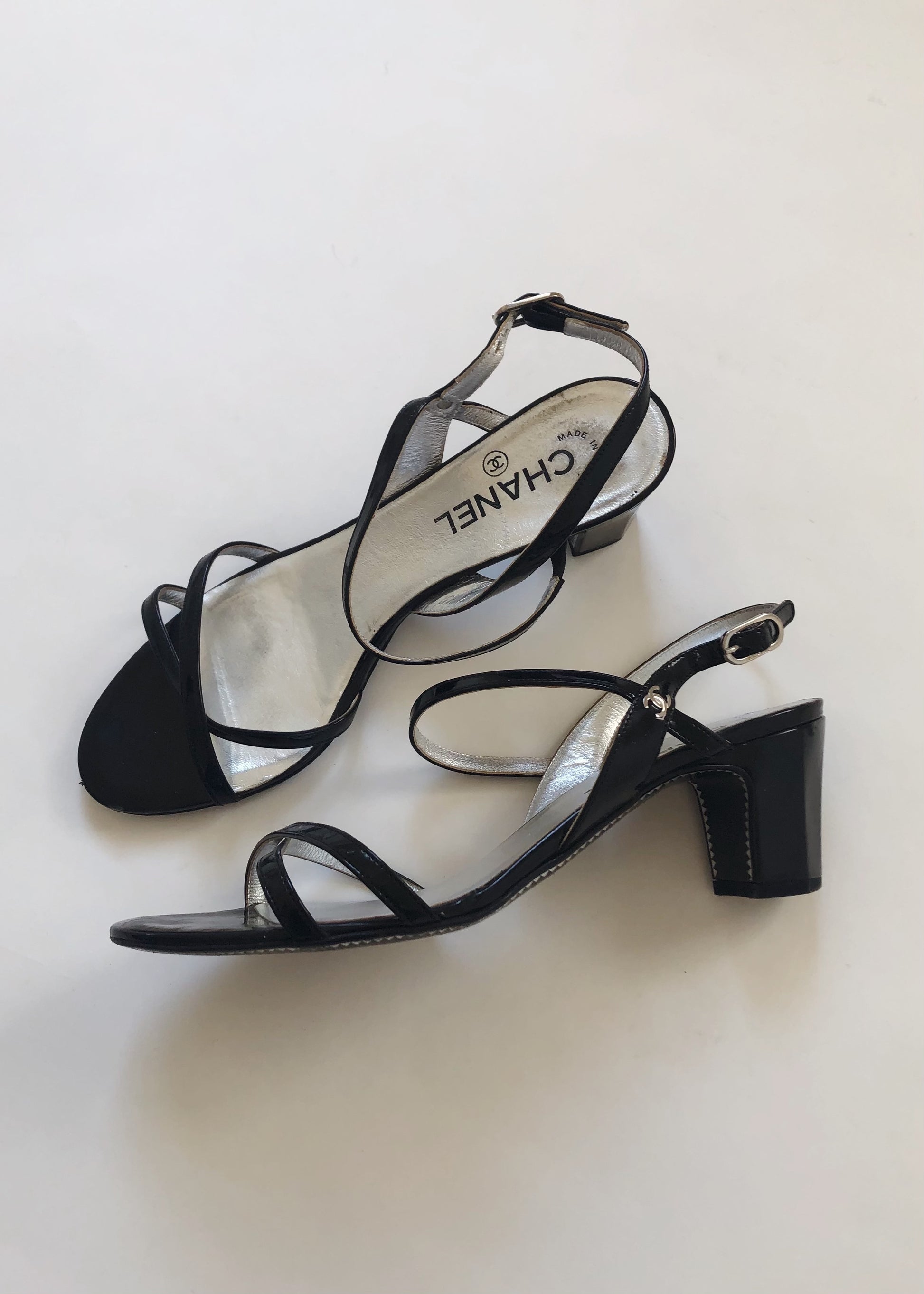 Black patent leather Chanel sandals with silver-tone buckle closures at ankles featuring CC logo accent and covered block heels.