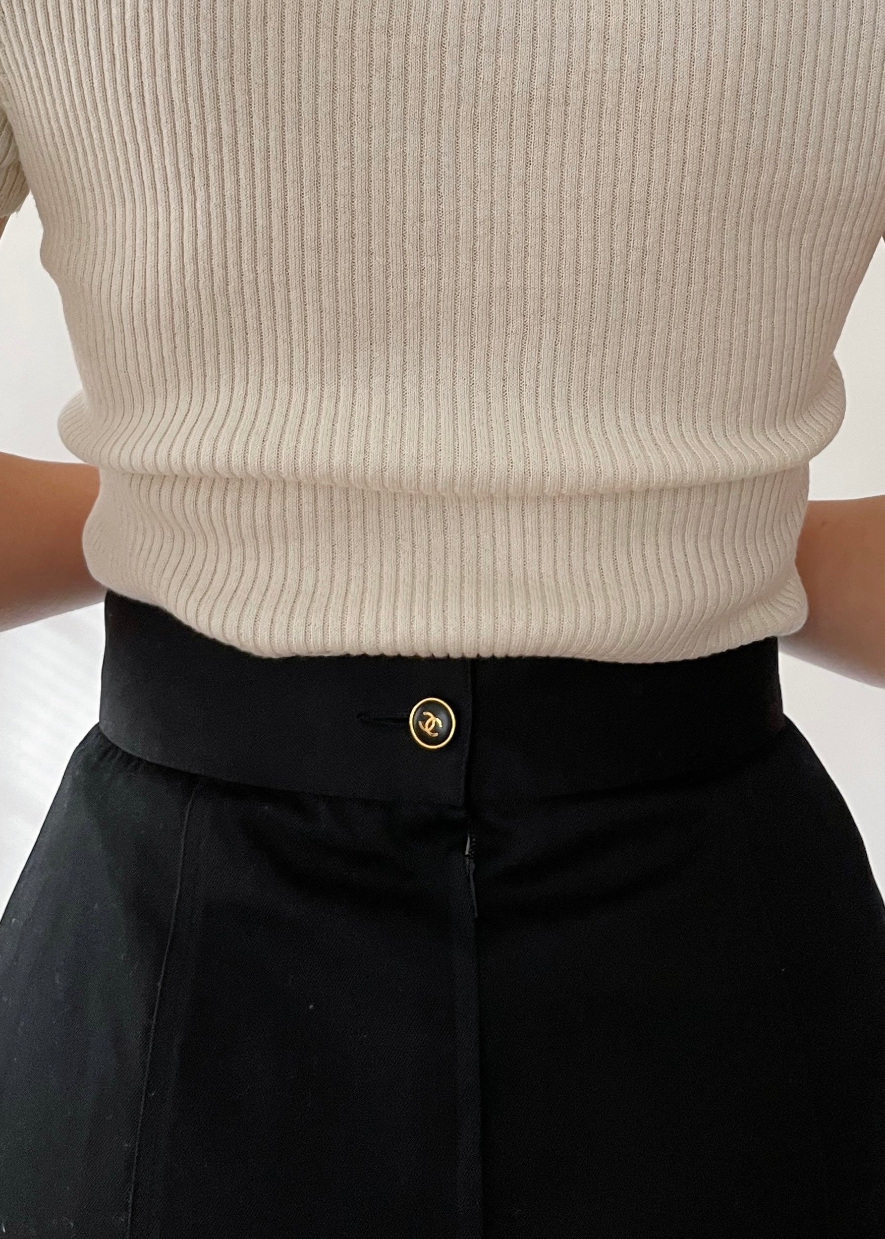 Stunning vintage Chanel black pencil skirt with a signature "CC" back button for closure. It features a subtle back zipper.