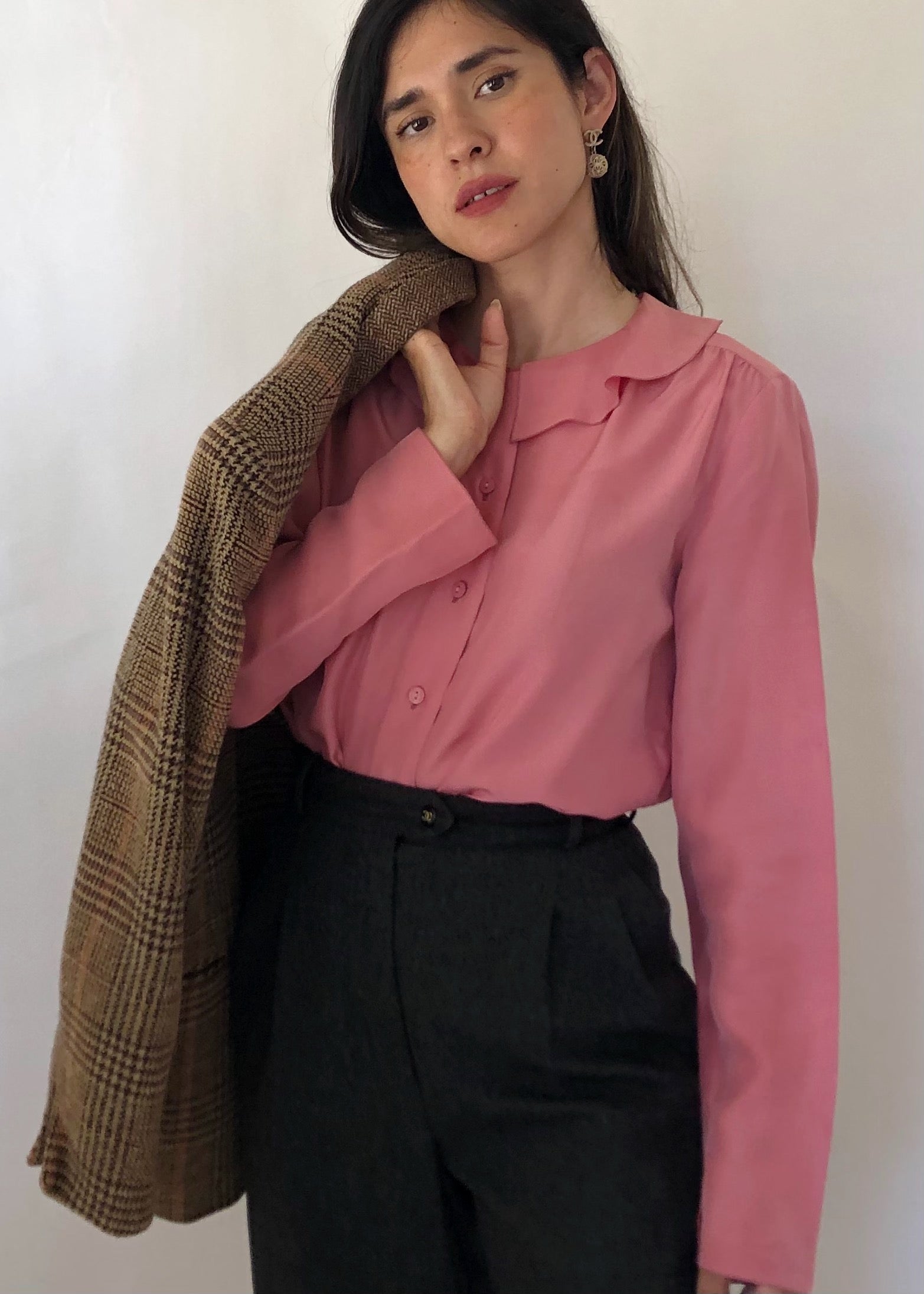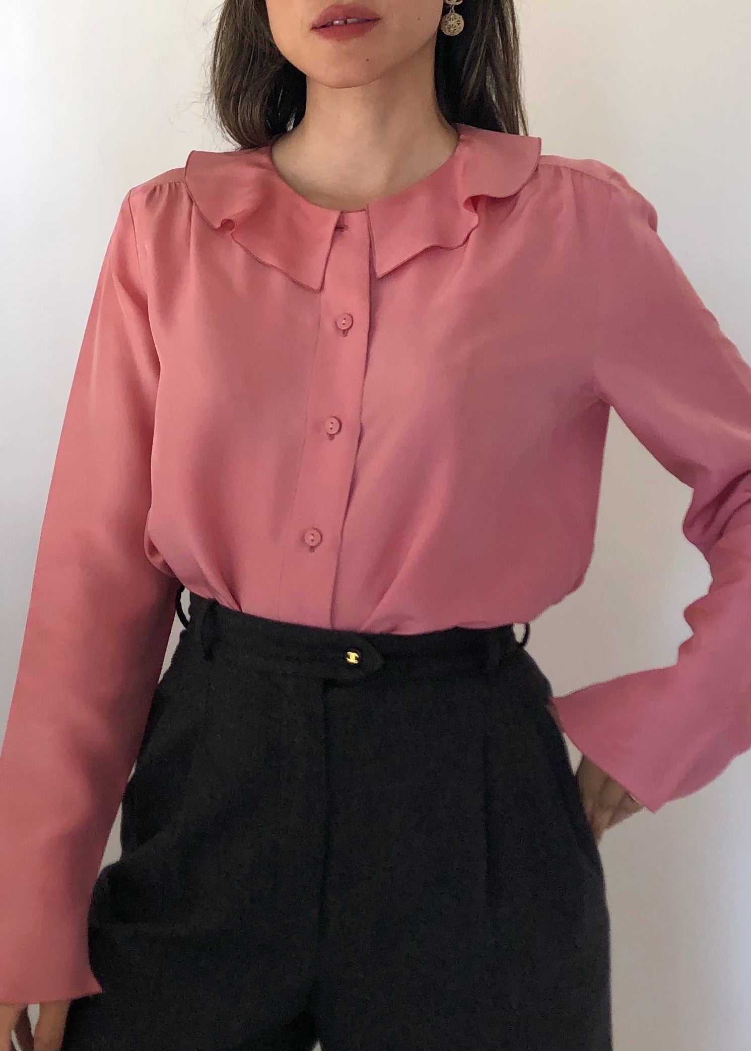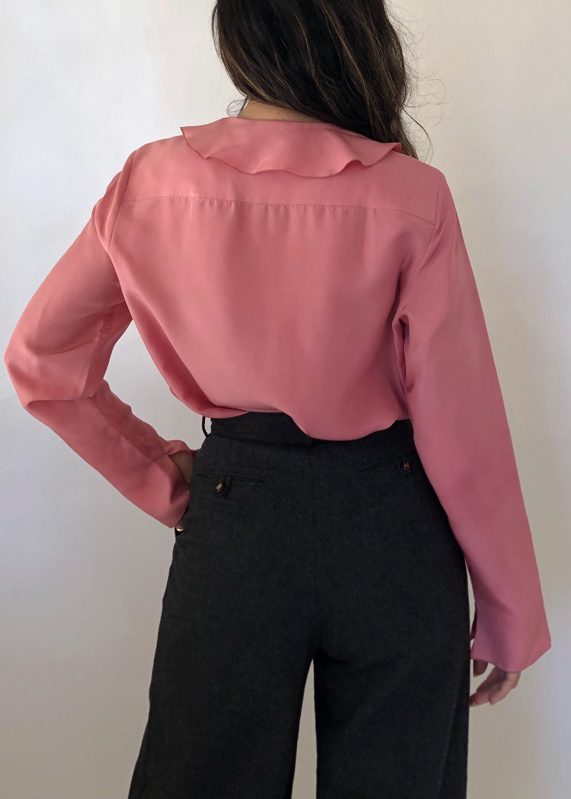 Vintage Chanel pink silk blouse with a beautiful and subtle ruffle collar. Featuring slits on the sleeves. Slight imperfections, but still so beautiful and a collectible. Circa late 90s.