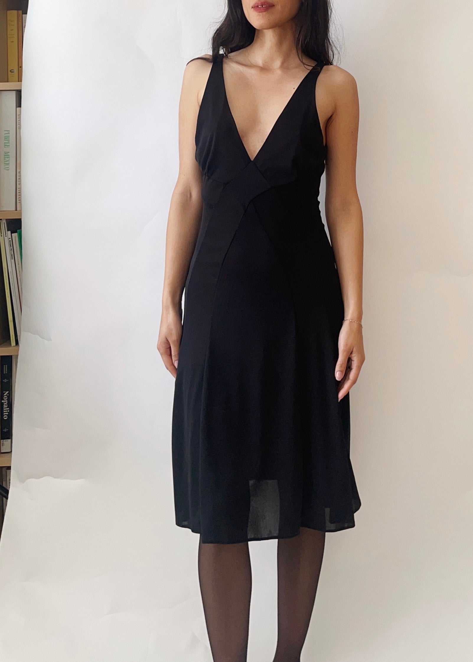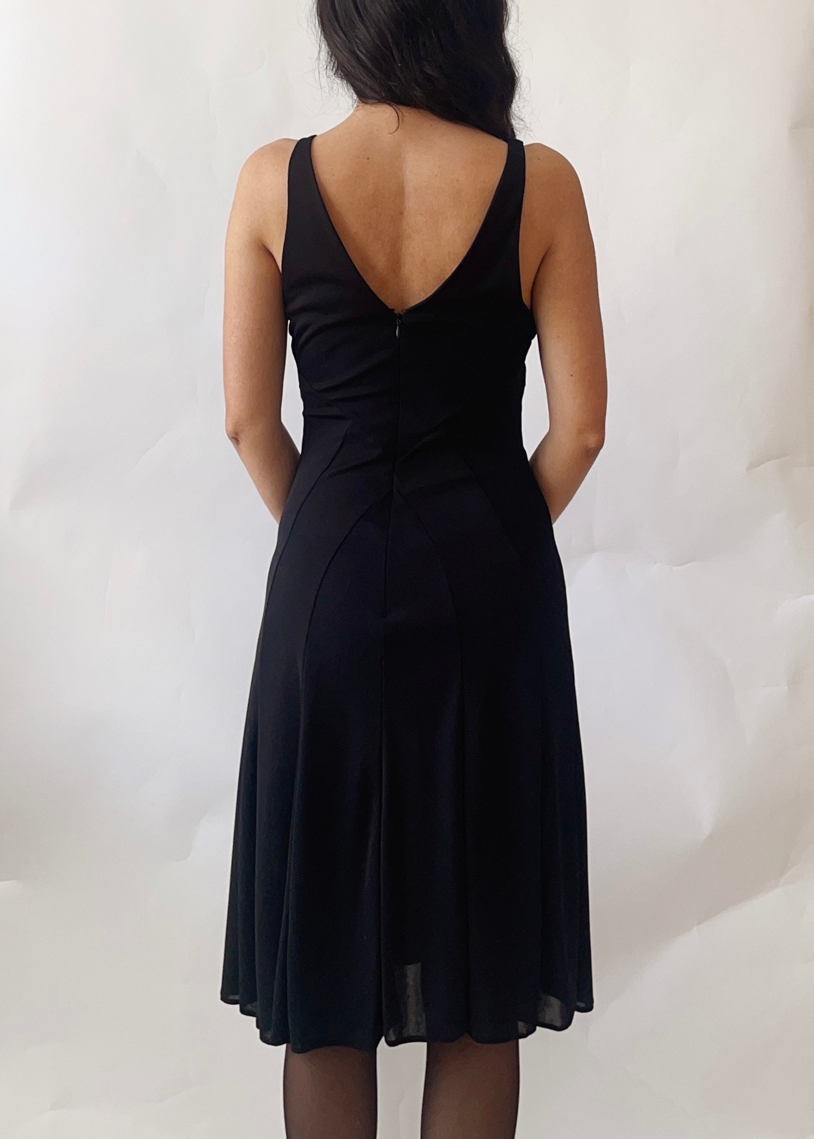 Stunning D&G black deep-v neck dress with a sheer and lightweight bottom. If features a subtle back zipper. From the 90s.