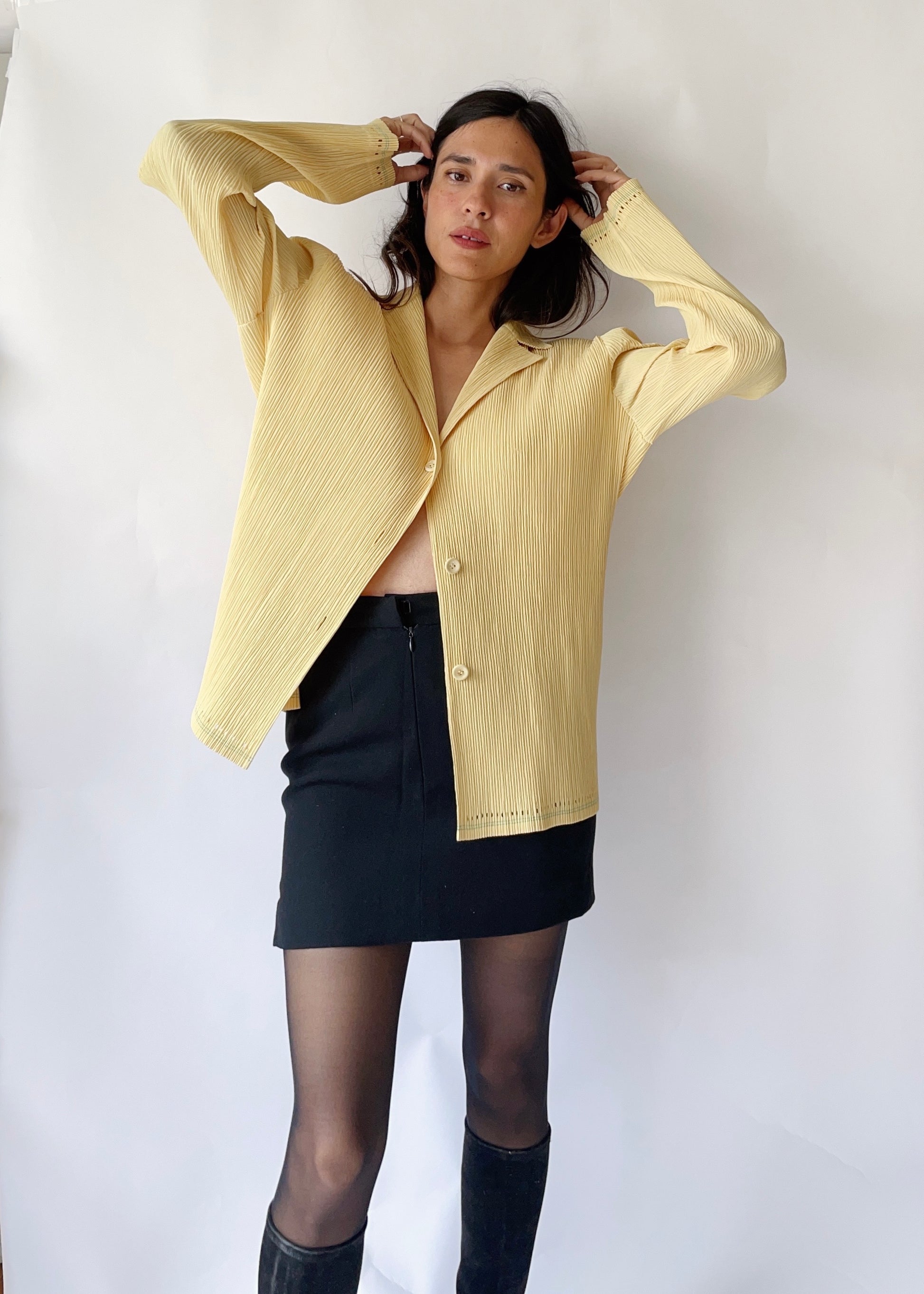 Forever timeless vintage Issey Miyake pleats top in a soft yellow. This long sleeve top features a collar and two subtle front pockets. Top front button has some slight wear, price reflects it.