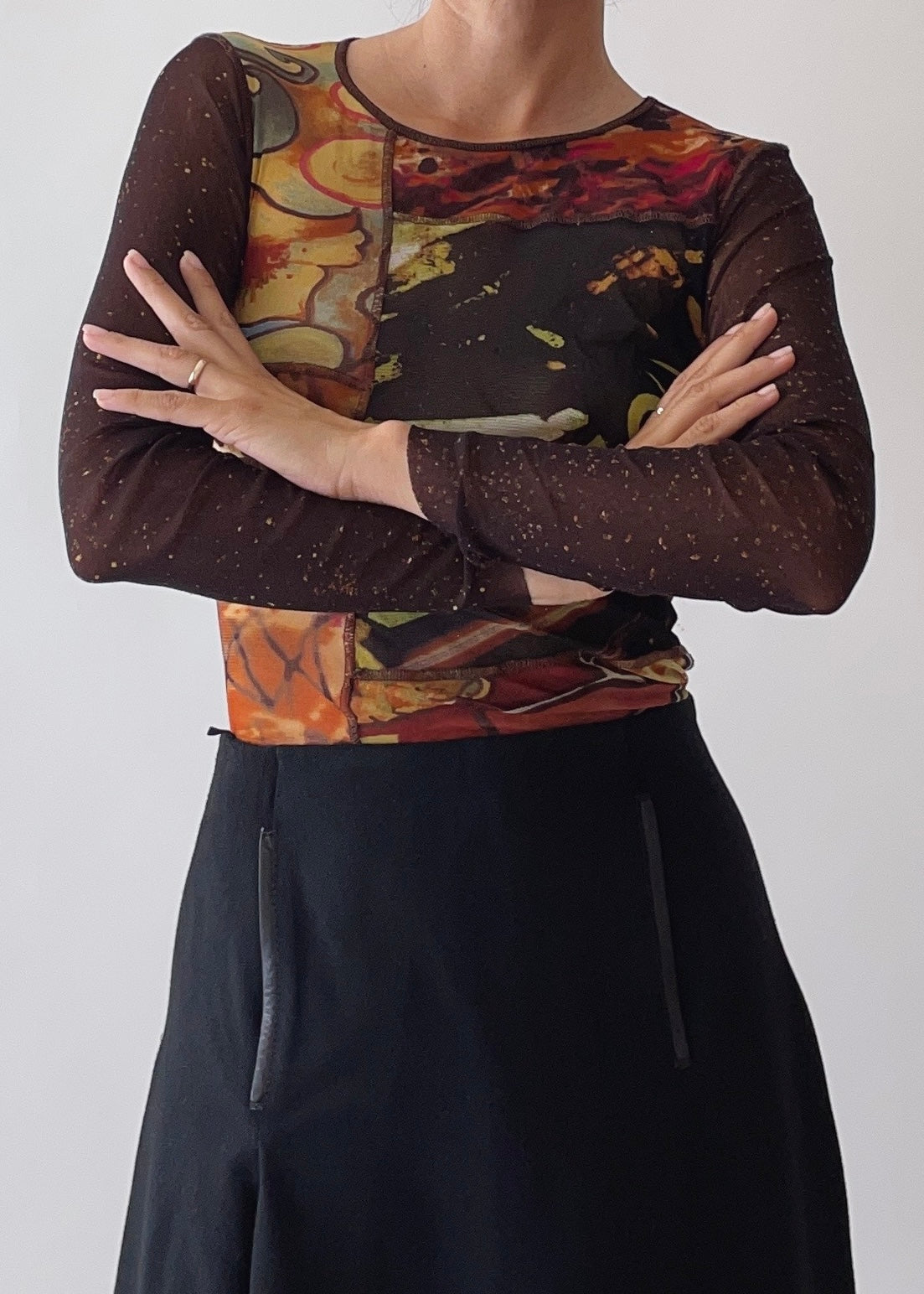 Stunning 90s Kenzo Jeans mesh top with an abstract print. It is super light and soft. Fabric has a nice stretch to hug you in the right places.