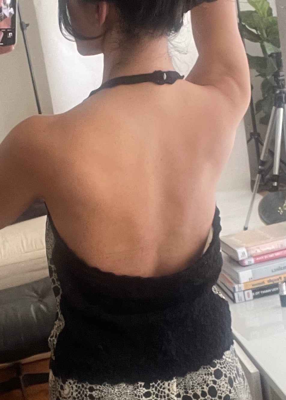 A rare vintage Moschino skirt set featuring a doily pattern print on both top and skirt. It has crochet straps and back with a button closure.