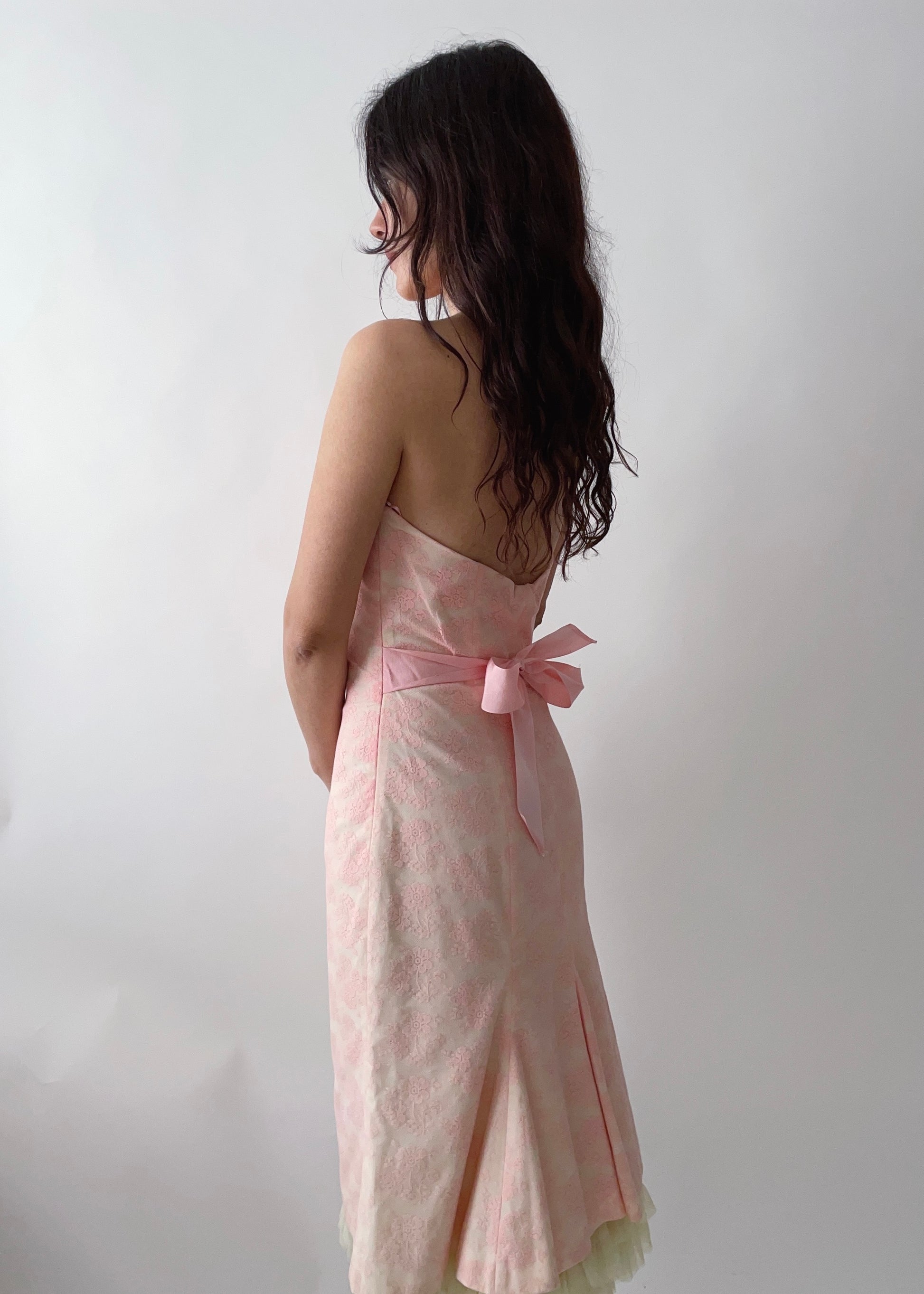 A stunning vintage Moschino Cheap and Chic pink dress with the perfect ruffle tulle for a romantic spin. It features a sweetheart neckline and a pink bow. Subtle side zipper. It is unworn and has original tags. Perfect for a spring and summer wedding or date.