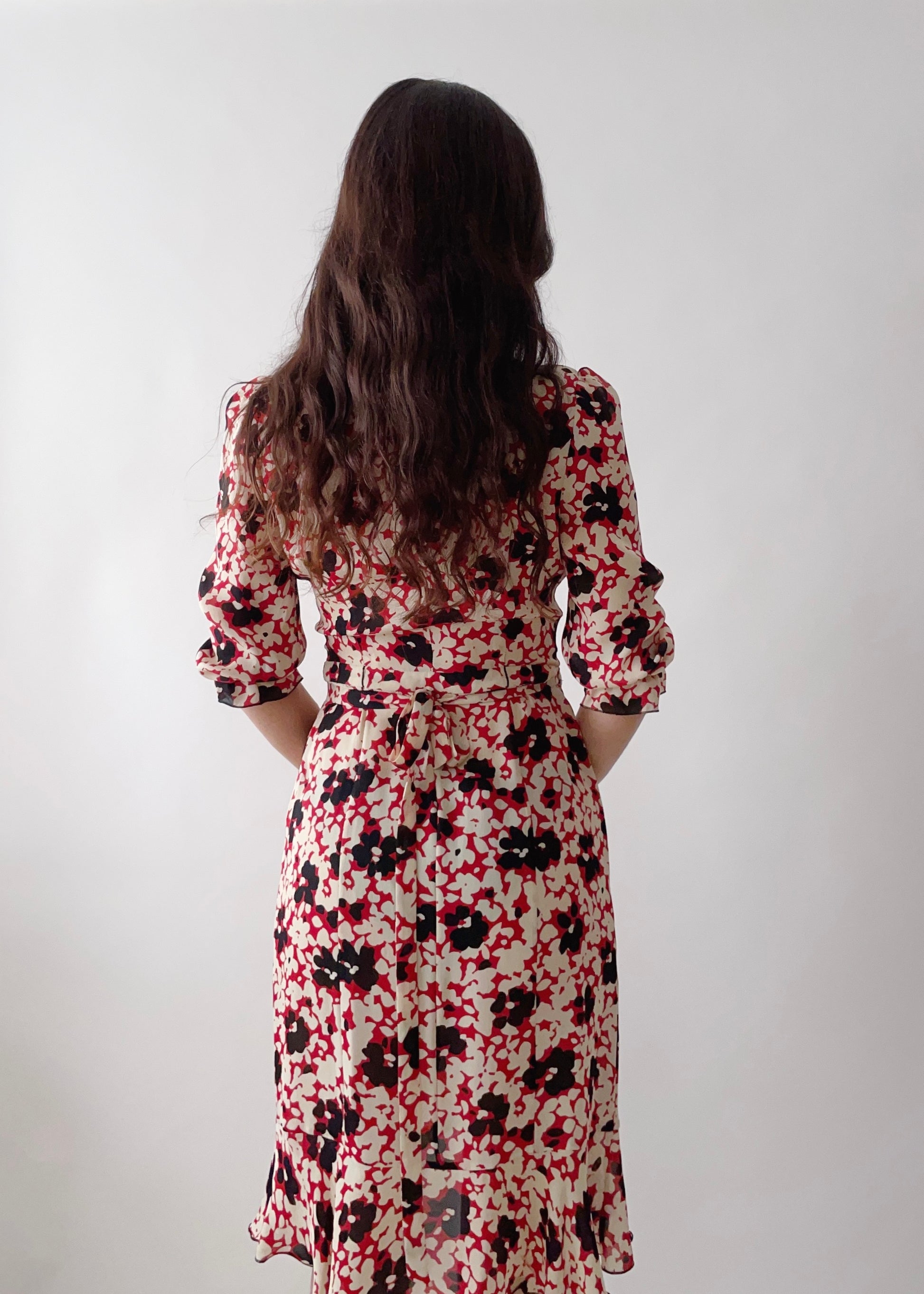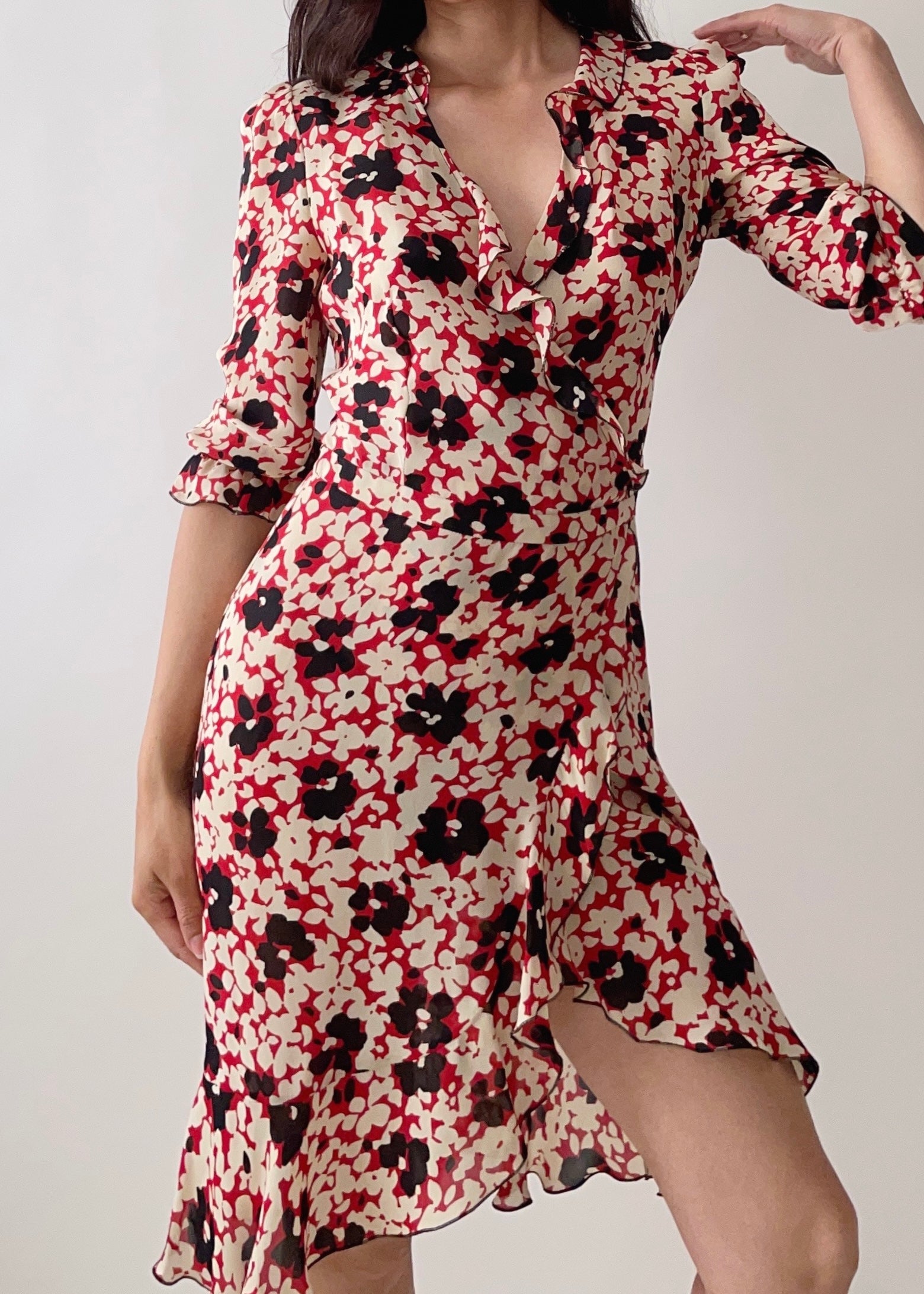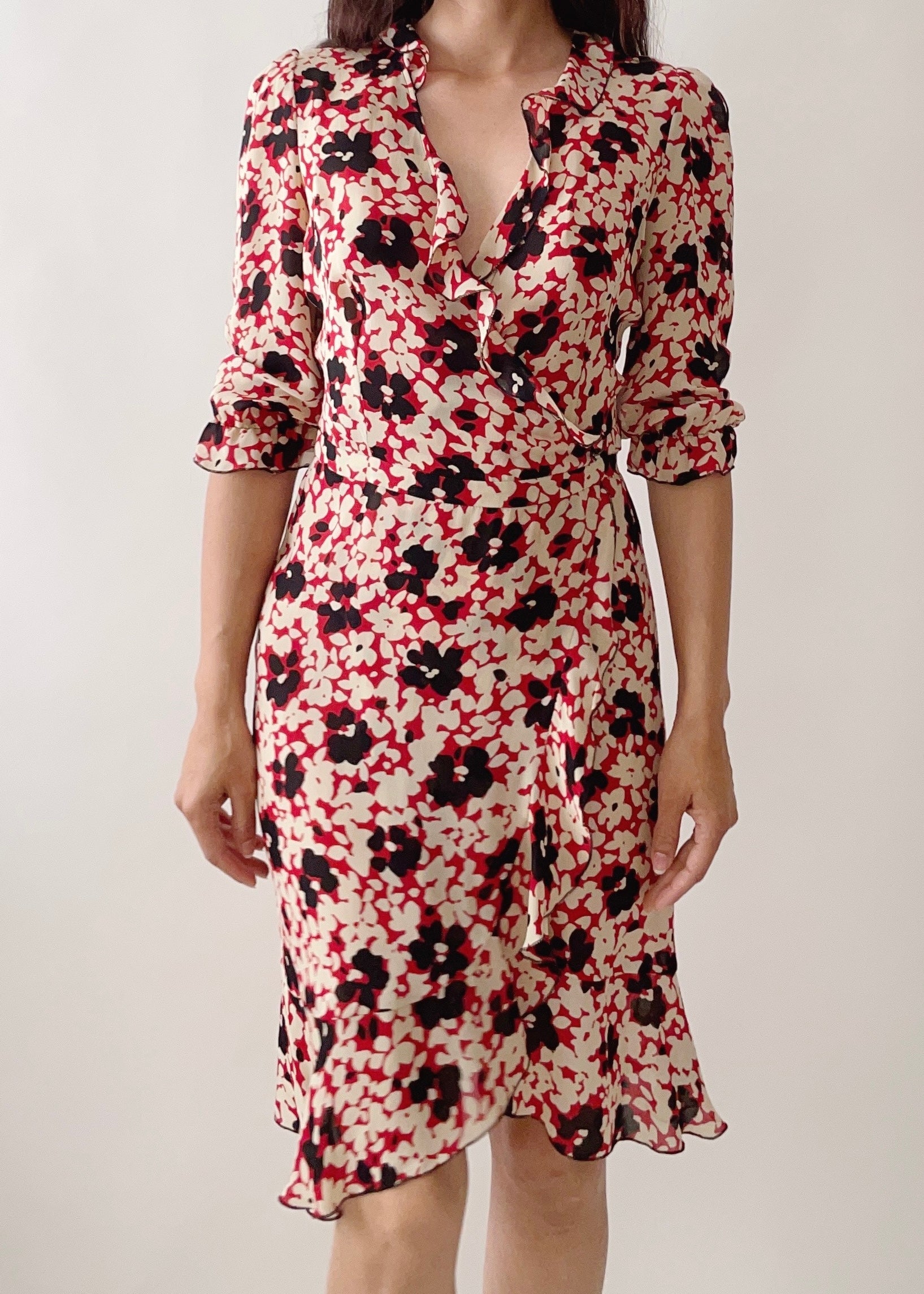 A pretty Italian summer dream dress by Moschino. This silk wrap dress features a floral pattern and ruffle trimming.