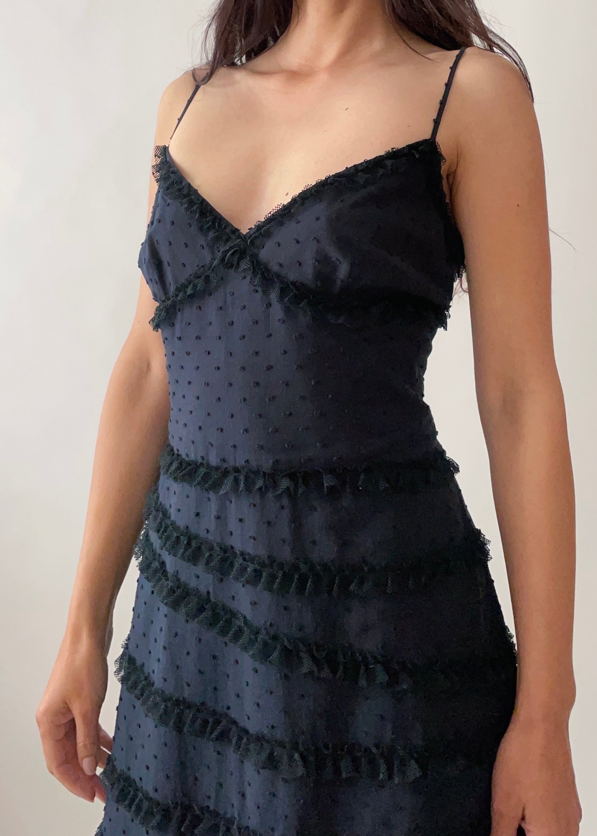 Vintage Moschino navy blue spaghetti strap dress with ruffle black lace detailing. It features an A-line bottom and subtle side zipper. A perfect dress for the upcoming warmer days.