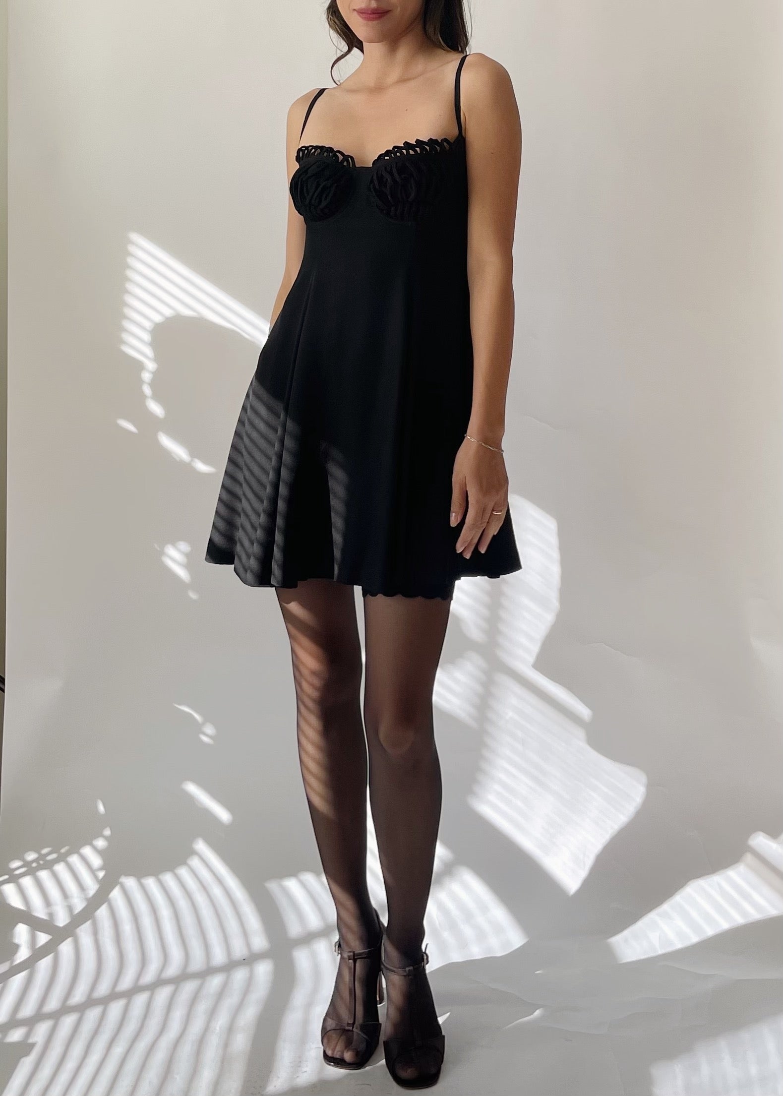 Beautiful vintage Sophie Sitbon Couture black dress with a full swing bottom. If features a fitted waist with gorgeously detailed cups. Best for a shorter torso. Subtle zipper closure on back.