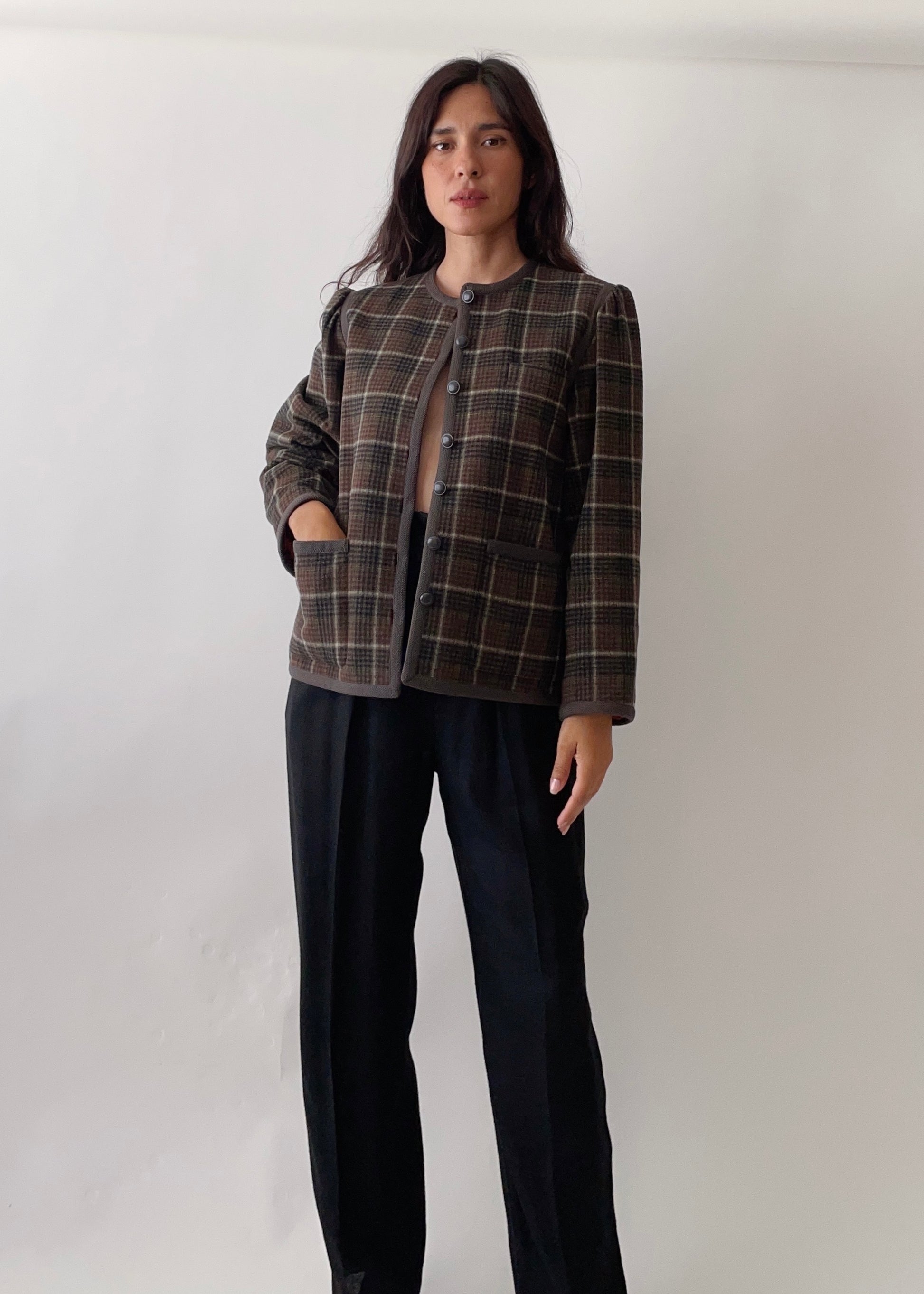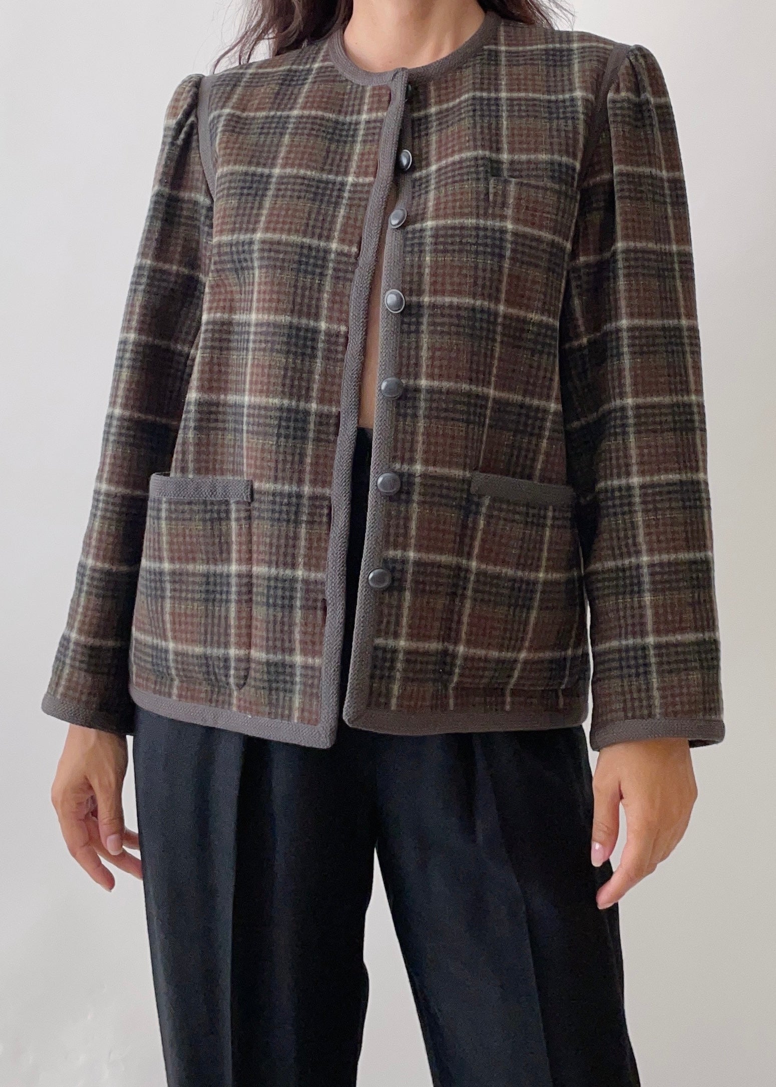 Timeless vintage Yves Saint Laurent Rive Gauche green plaid wool blend jacket with signature braid trim. It features two front pockets, subtle puffy sleeves, and satin lining. From the early Rive Gauche collections, a classic. In excellent condition.