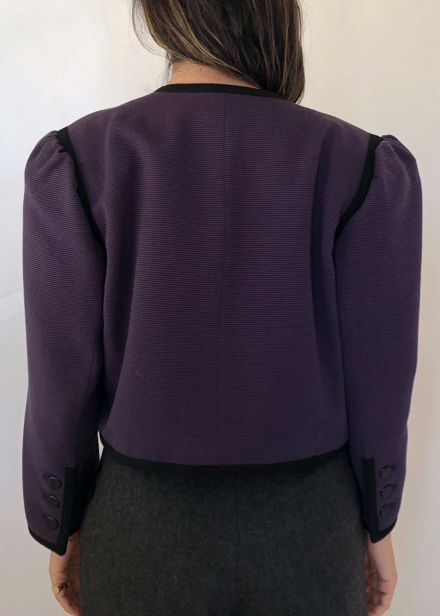 Vintage YSL Rive Gauche purple crop jacket with an open front. It features faux buttons on front and black trimming. Beautiful YSL piece from the 1970s.