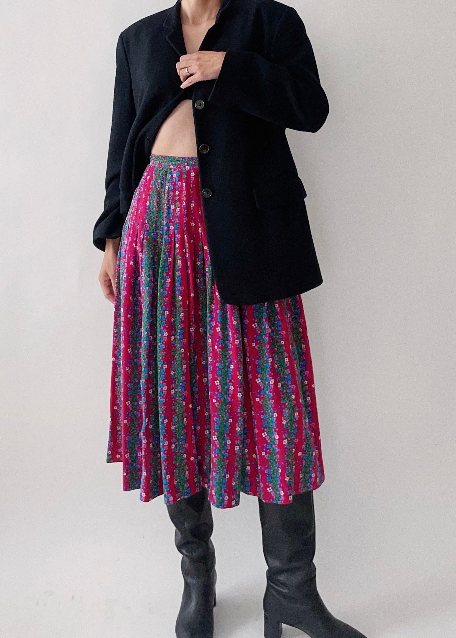 A rare vintage YSL Rive Gauche silk floral skirt with the perfect pleats and swing. It features a side hook-and-eye closure. In amazing vintage condition. From the 1977 floral print collection.