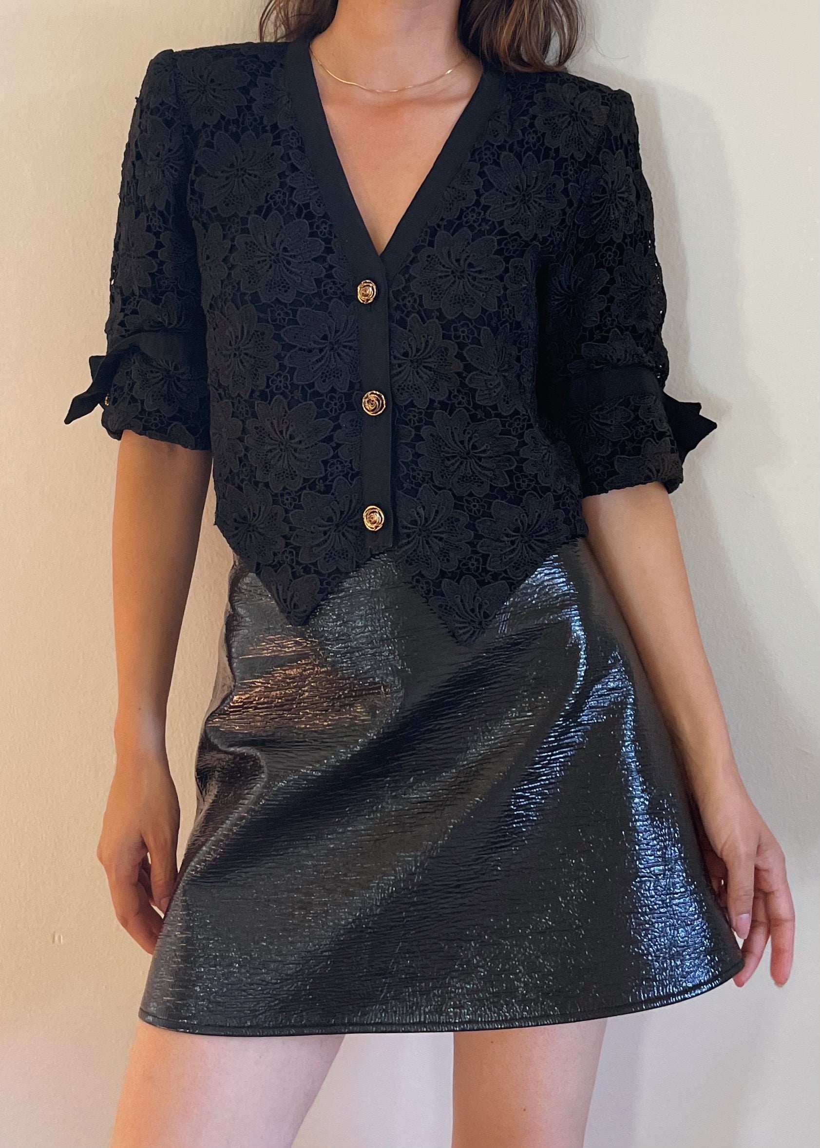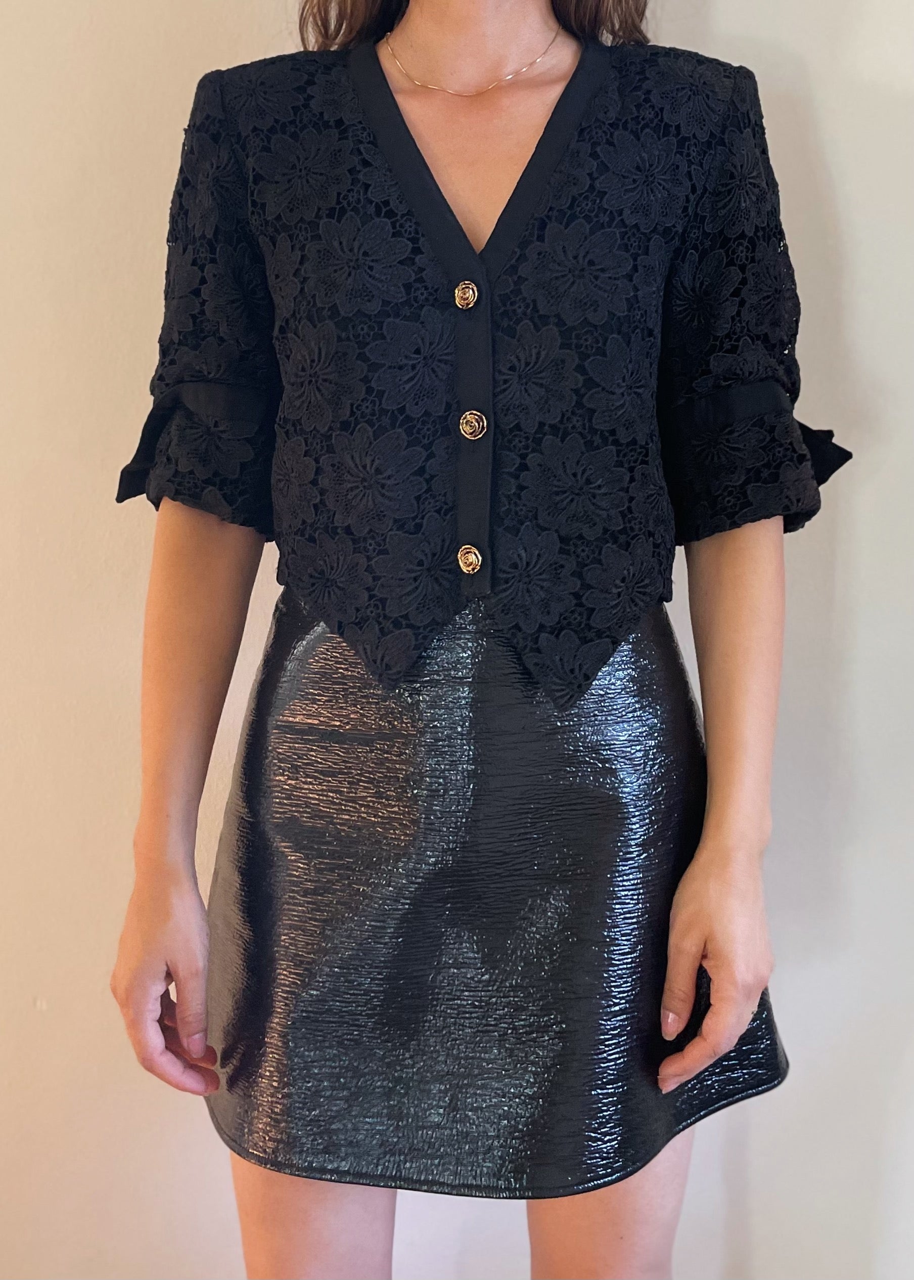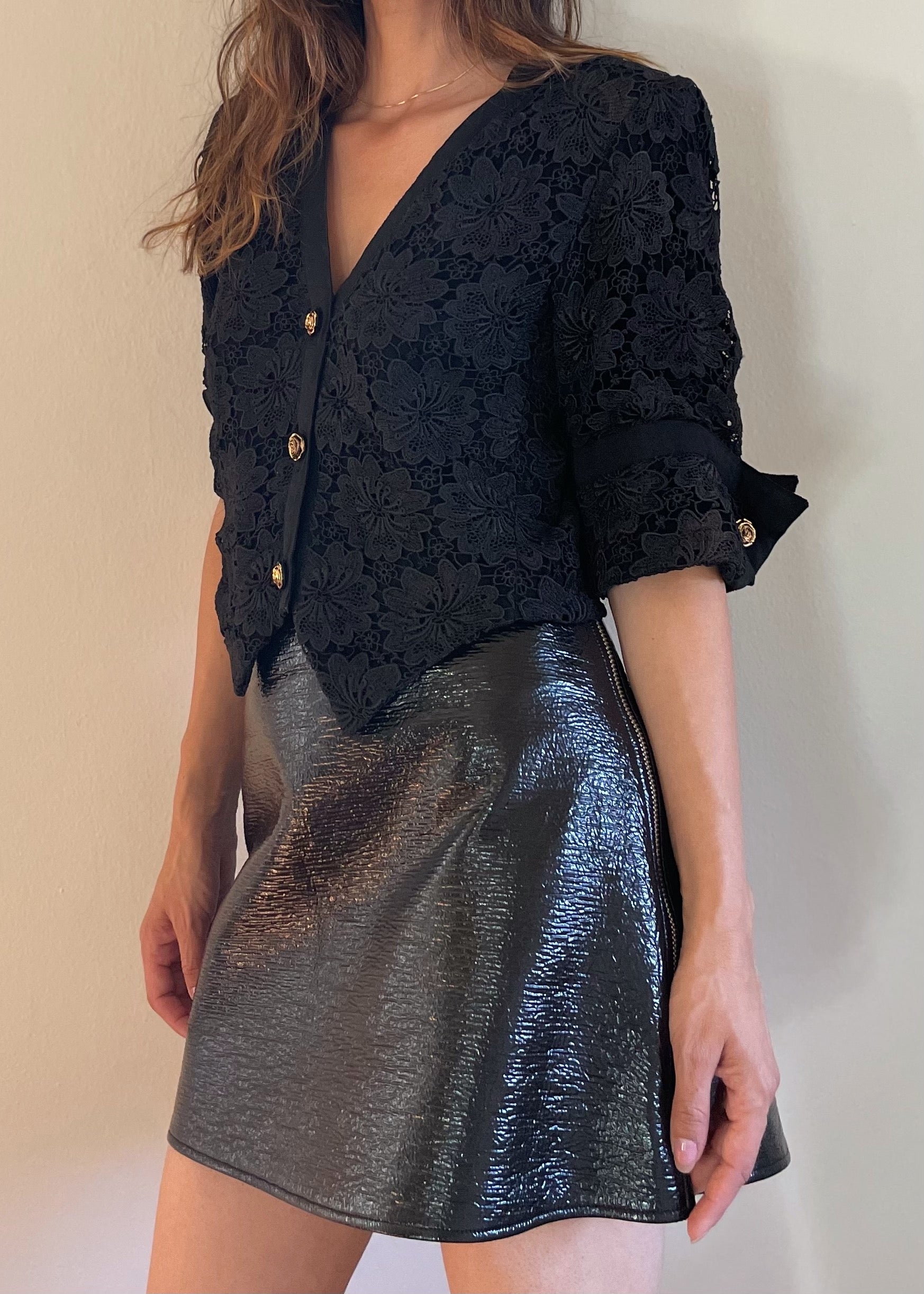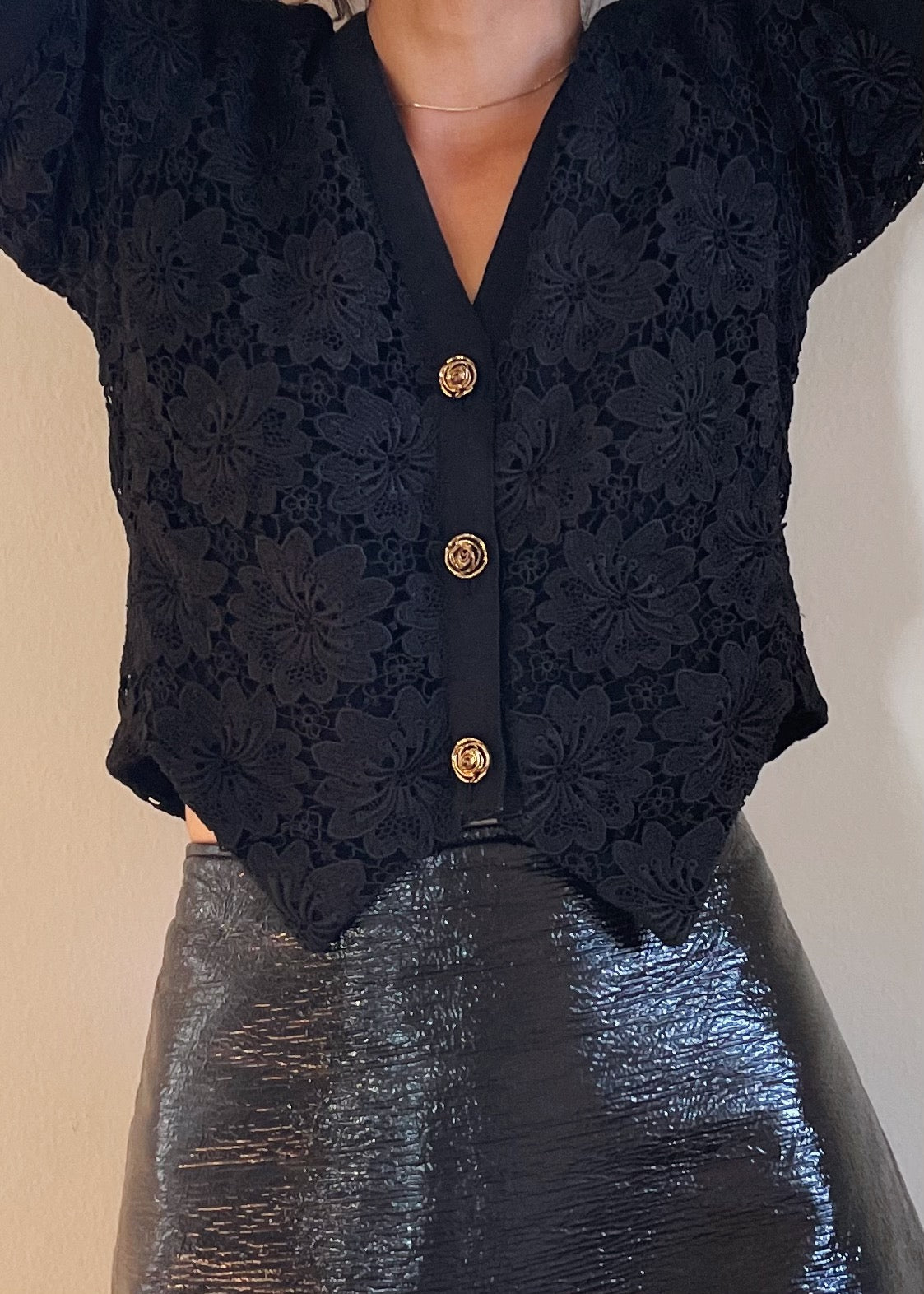 Gorgeous Yves Saint Laurent Rive Gauche bolero lace top with gold toned rose buttons. The perfect crop length with a structured fit.