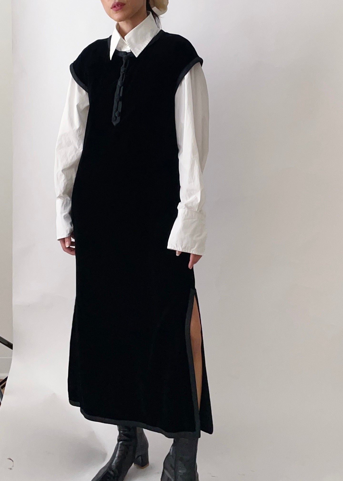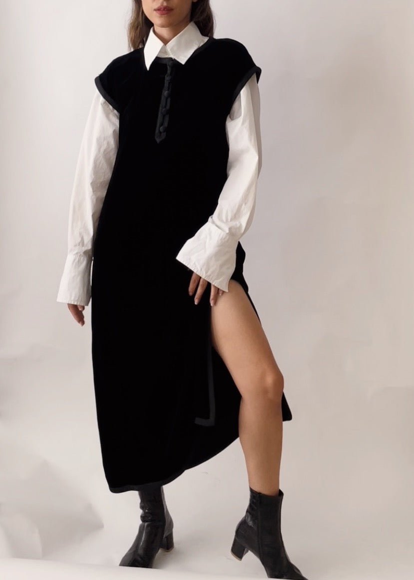 Vintage Yves Saint Laurent black velvet dress with rope stitching. Featuring two gorgeous side slits. From the 1970s. A beautiful and rare YSL Rive Gauche piece. Made in France.
